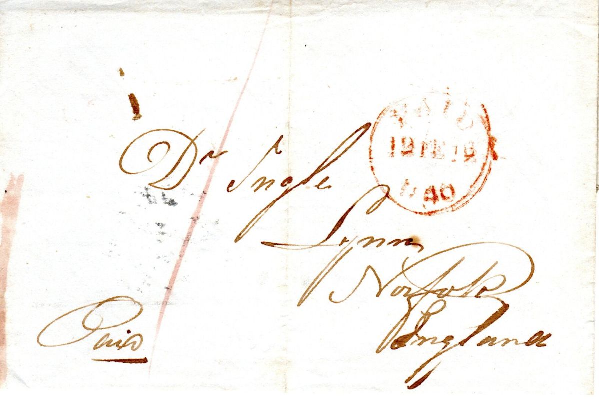 | 10 | JERSEY - Feb 1840 - Entire from Jersey to Norfolk. With manuscript '1' in red. Endorsed 'Paid'. With Jersey double arc datestamp and London transit datestamp in red. Short period of 1d postage prior to introduction of postage stamps | 20.00 | 20.00 | |