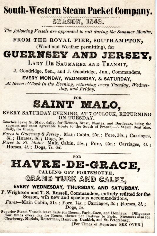 | 11 | South Western Steam Packet Co. - 1843 Fine scarce advertising card for sailings from Southampton to Guernsey and Jersey on the ship , Lady de Sausmarez | 12.00 | 16.00 | |