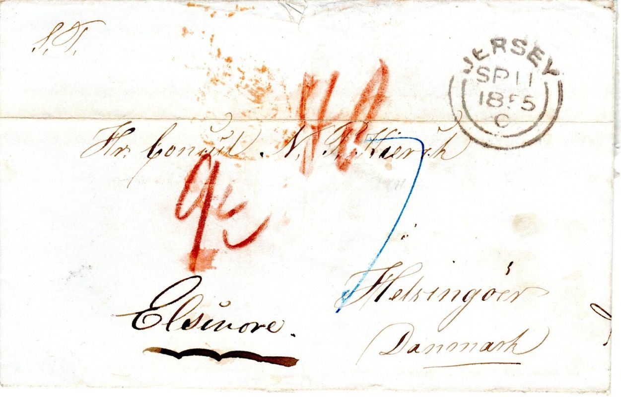 | 21 | JERSEY - Sep 1855 Wrapper to Denmark. With superb Jersey double arc datestamp in black, code 'C'. Routed via London and Hamburg. With fine Hamburg transit datestamp on reverse. With various Paid or Charge marks in manuscript. | 25.00 | 25.00 | |