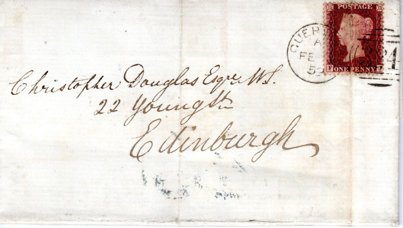 | 22 | GUERNSEY - 1859 Entire from Guernsey to Edinburgh. With QV 1d stars and Guernsey duplex cancel (SG Cat no. GC22). With fine Weymouth transit datestamp and Edinburgh arrival datestamp. Item has a vertical fold through the stamp. | 10.00 | | |