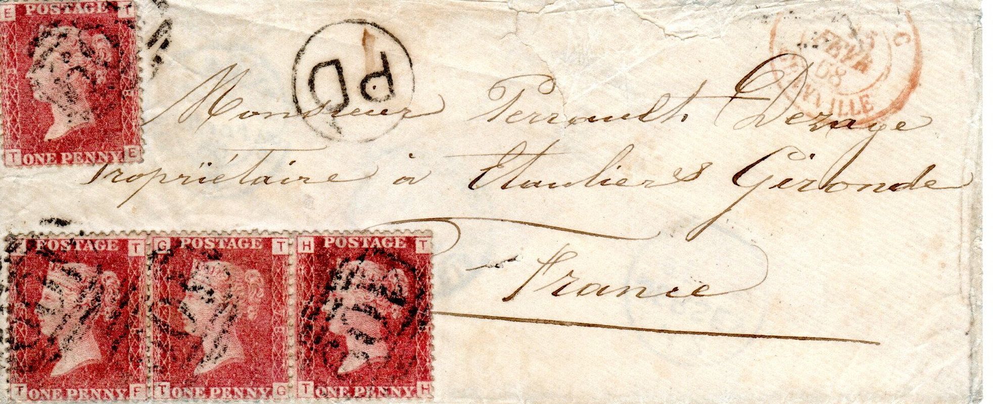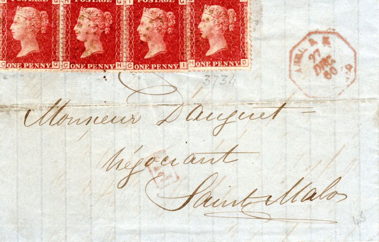 | 24 | GUERNSEY - 1860 Boite Mobile to St Malo. With strip of 3x QV 1d reds plus another 1d red (4d rate for ¼ oz.) Cancelled with faint St Malo large numeral 3743 lozenge obliterator (SG CF66). Plus a red octagonal ANGL. B.M. St Malo datestamp for October 1860 (SG CF47) | 100.00 | | |