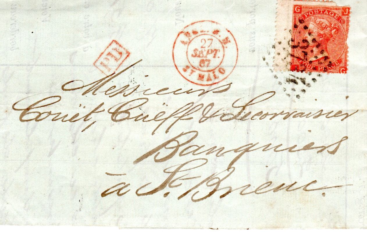 | 26 | JERSEY - 1867 Entire from Jersey Joint Stock Bank to St Brieuc, France. With QV 4d vermillion cancelled with lozenge 3734 - St Malo ( SG cat CF66). Good d/circle Boite Mobile cancel 'ANGL B.M. ST. MALO' in red (SG CF52). Fine clean rare item | 120.00 | 120.00 | |