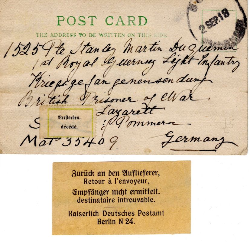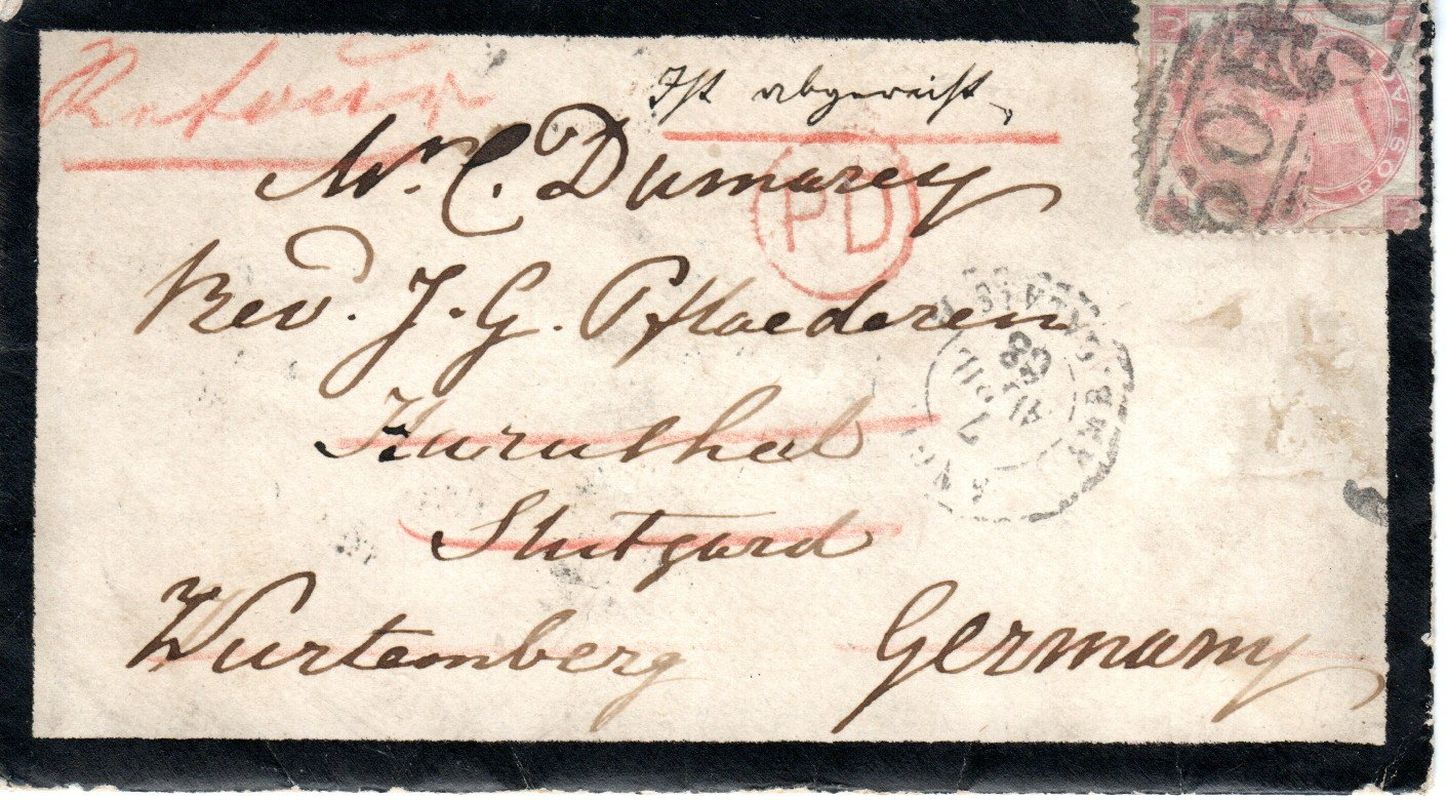 | 28 | JERSEY - 1868. Mourning envelope to Stuttgart with 4d GB stamp cancelled with a 409 horiz. Barred obliterator Red PD in circle (SG cat no. CF89) and ANGL. AMB Calais (7 April 68). Stuttgart backstamp. Then returned to sender with a London framed cachet in red - 'SENT BACK TO ENGLAND WITHOUT A REASON FOR NON DELIVERY. Includes 2 photos of two women | 25.00 | 20.00 | |