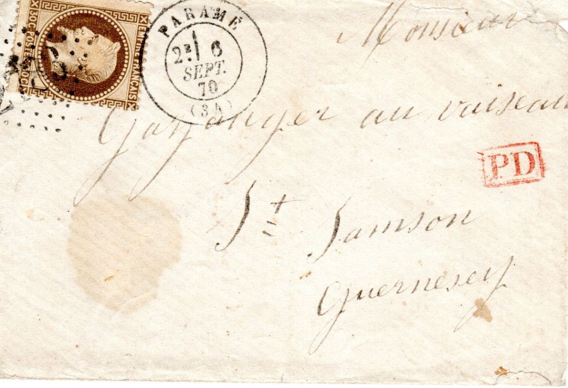 | 30 | GUERNSEY - 1870 Small envelope to Guernsey with French 30c Empire Francais stamp cancelled by Lozenge No.2783 (Salignac Dordogne). A very nice boxed red PD is shown on the face with, on the reverse, a transit datestamp of St. Malo | 15.00 | 15.00 | |