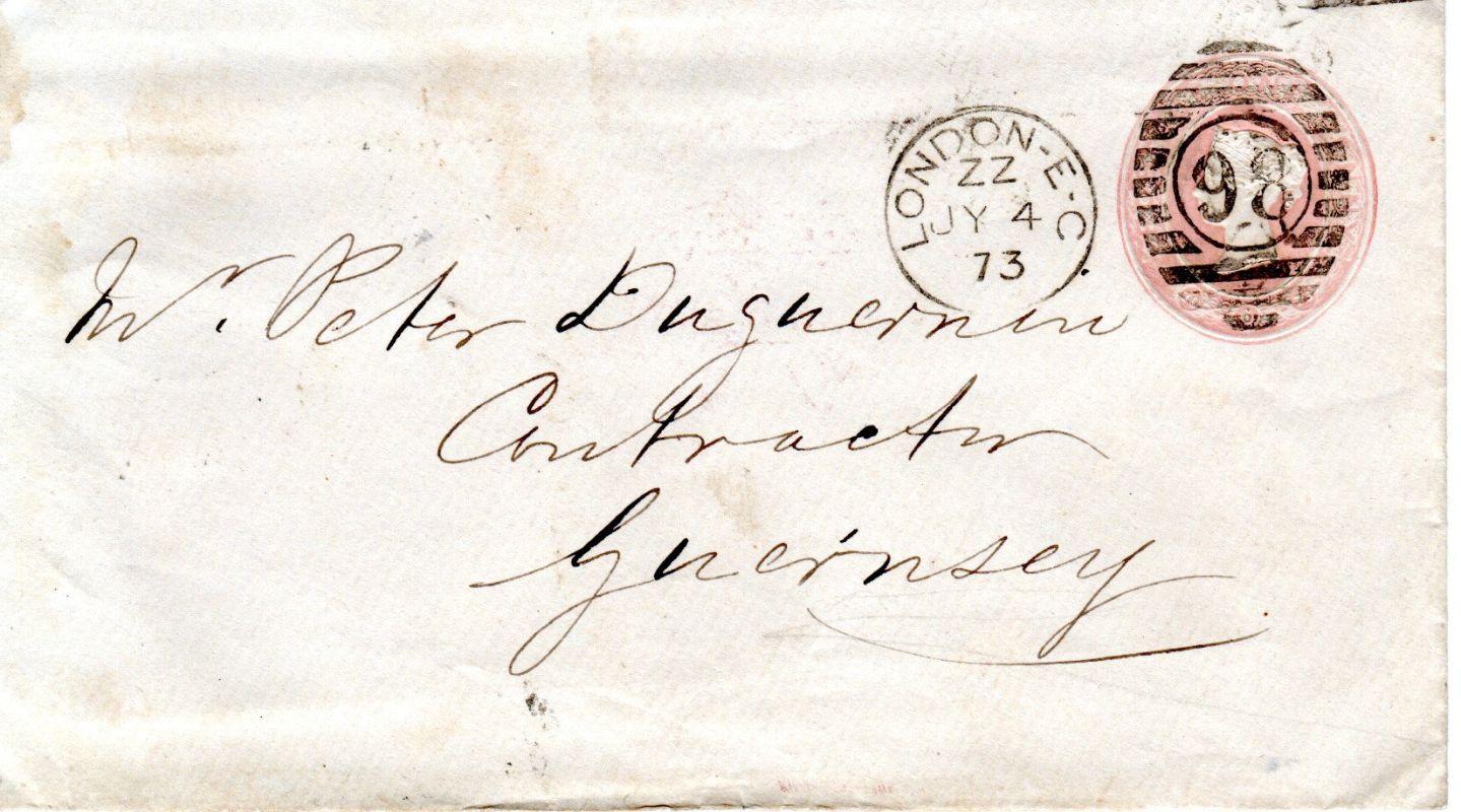 | 31 | GUERNSEY - 1873 GB 1d pink envelope with London E.C. datestamp. Addressed to P. Duquemin, Contractor, Guernsey. With Guernsey arrival datestamp | 6.00 | | |