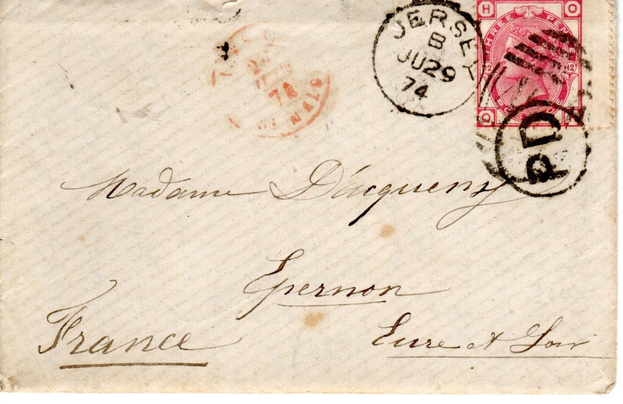 | 32 | JERSEY - 1874 cover to France at the 3d rate showing a 3d SG 103 Pl.12 cancelled by a Jersey 409 duplex on JU 29 1874. Also showing a circular PD in black for Paid to Destination. | 40.00 | 40.00 | |