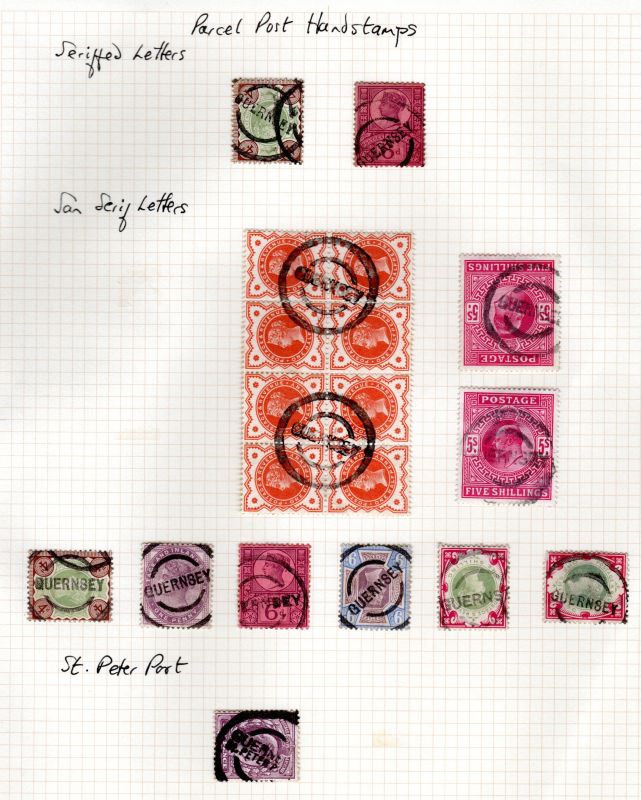| 36 | GUERNSEY - QV /KEVII - Album page with 11 single stamps all with Guernsey circular parcel handstamps plus block of 8 x QV ½d orange with fine complete handstamps. Includes 2 x KEVII 5/- stamps | 15.00 | 22.00 | |