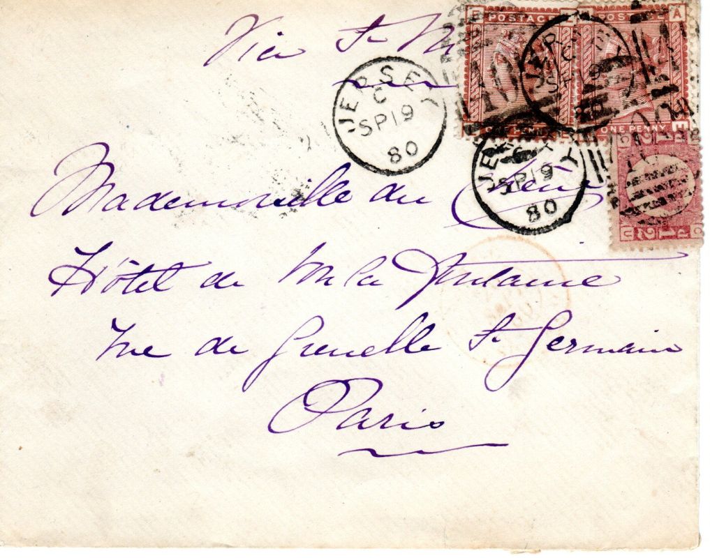 | 40 | JERSEY - 1880 2½d rate cover to Paris via St Malo made up using 2x 1d Venetian red and ½d Bantam Plate 9 cancelled by Jersey 409 duplexes for SP 19 1880. | 40.00 | 40.00 | |