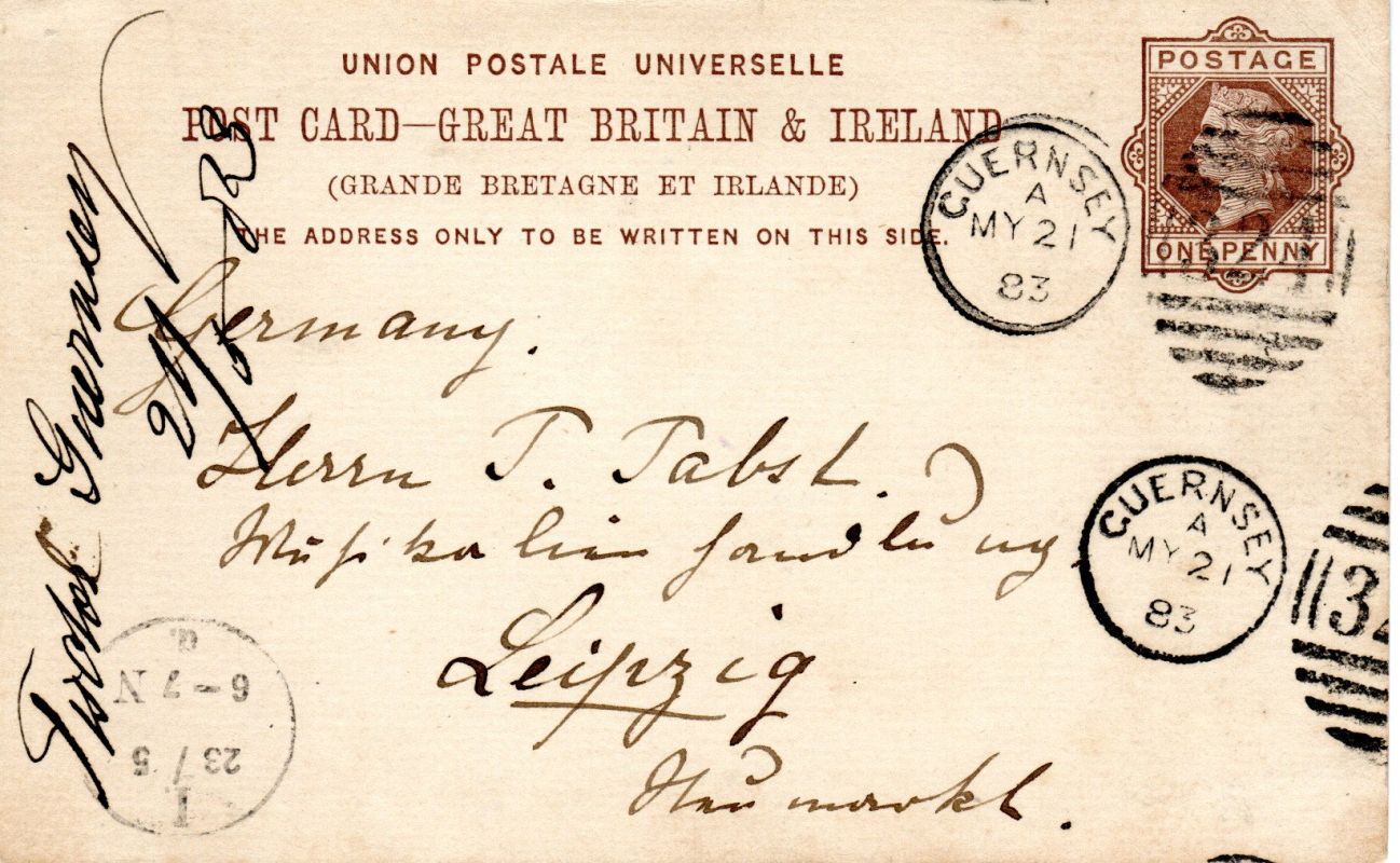 | 42 | GUERNSEY - 1883 QV 1d brown UPU postcard used to Leipzig and cancelled by a fine Guernsey 324 Duplex for MY 21 1883. A nice item. | 15.00 | | |