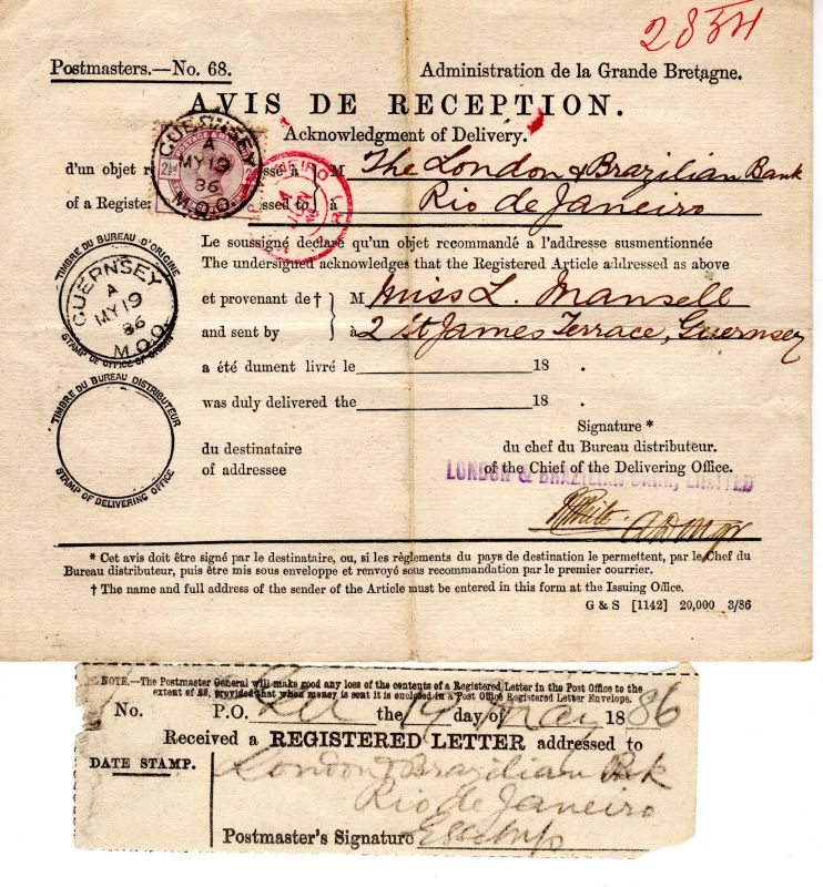 | 43 | GUERNSEY - 1886 Scarce Avis de Reception (AR) form relating to a letter from Guernsey to the London & Brazilian Bank, Rio de Janeiro. With QV 2½d lilac stamp (SG cat 190) cancelled with fine GUERNSEY M.O.O. datestamp for May 1886 | 50.00 | 85.00 | |