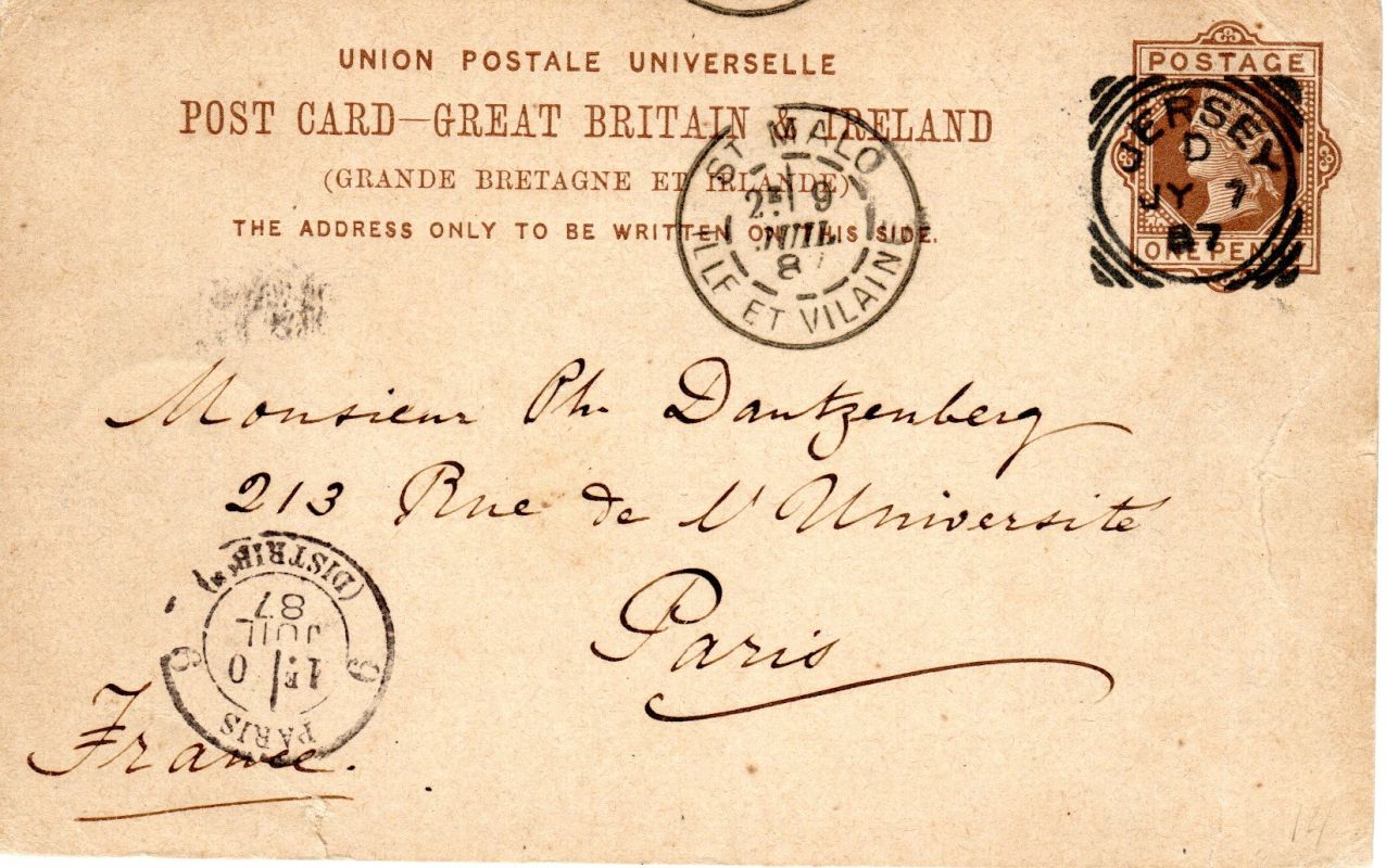 | 45 | JERSEY - 1887 QV 1d brown UPU postcard addressed to Paris cancelled by a superb Jersey squared circle for JY 7 1887. | 20.00 | | |