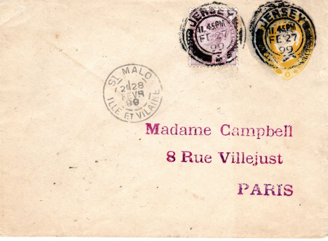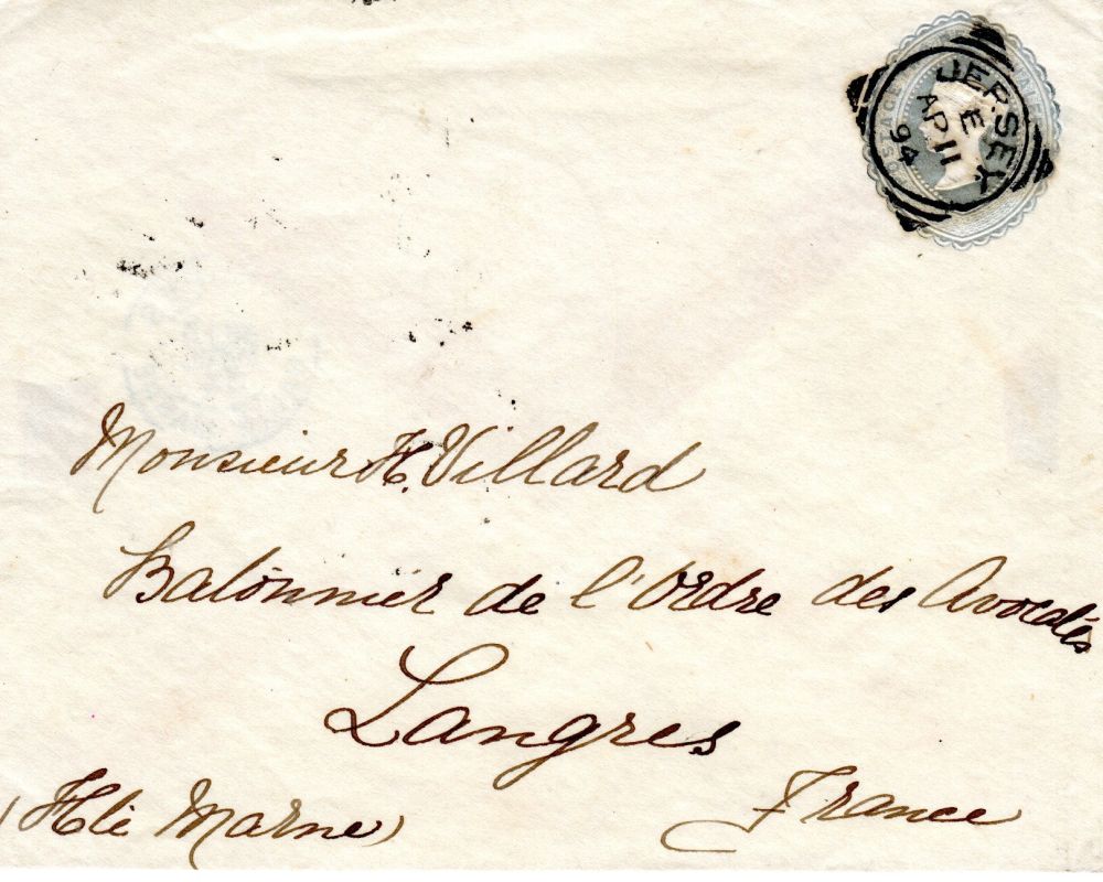 | 52 | JERSEY - 1894 2½d blue embossed postal stationery envelope to France cancelled by a Jersey squared circle for AP 11 1894 Code E. | 25.00 | | |