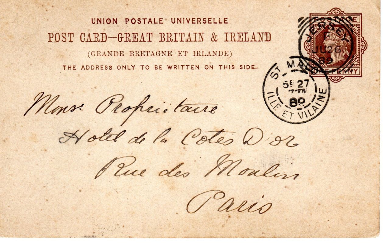 | 48 | JERSEY - 1889 UPU One Penny Postal Stationary postcard to Paris. Fine strikes Jersey squared circle datestamp and St Malo transit datestamp | 12.00 | 12.00 | |