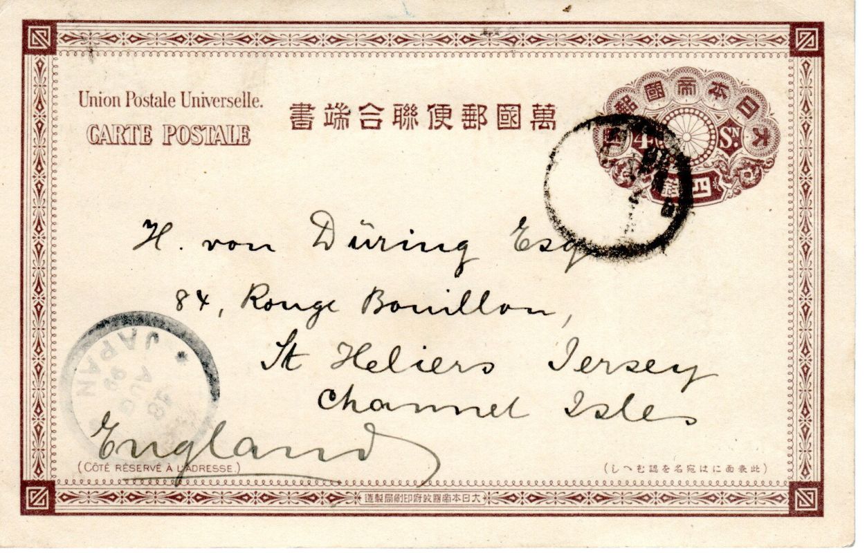 | 49 | JERSEY - 1889 Attractive UPU postcard from Japan with 18 AUG 99 Cancel. | 15.00 | | |