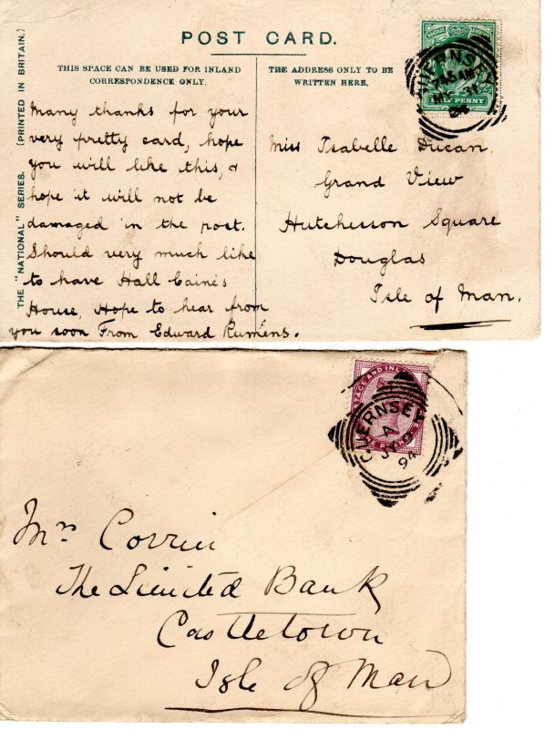 1. 1894 cover with QV 1d lilac addressed to 'The Limited Bank, Castletown, Isle of Man.' Code A.
