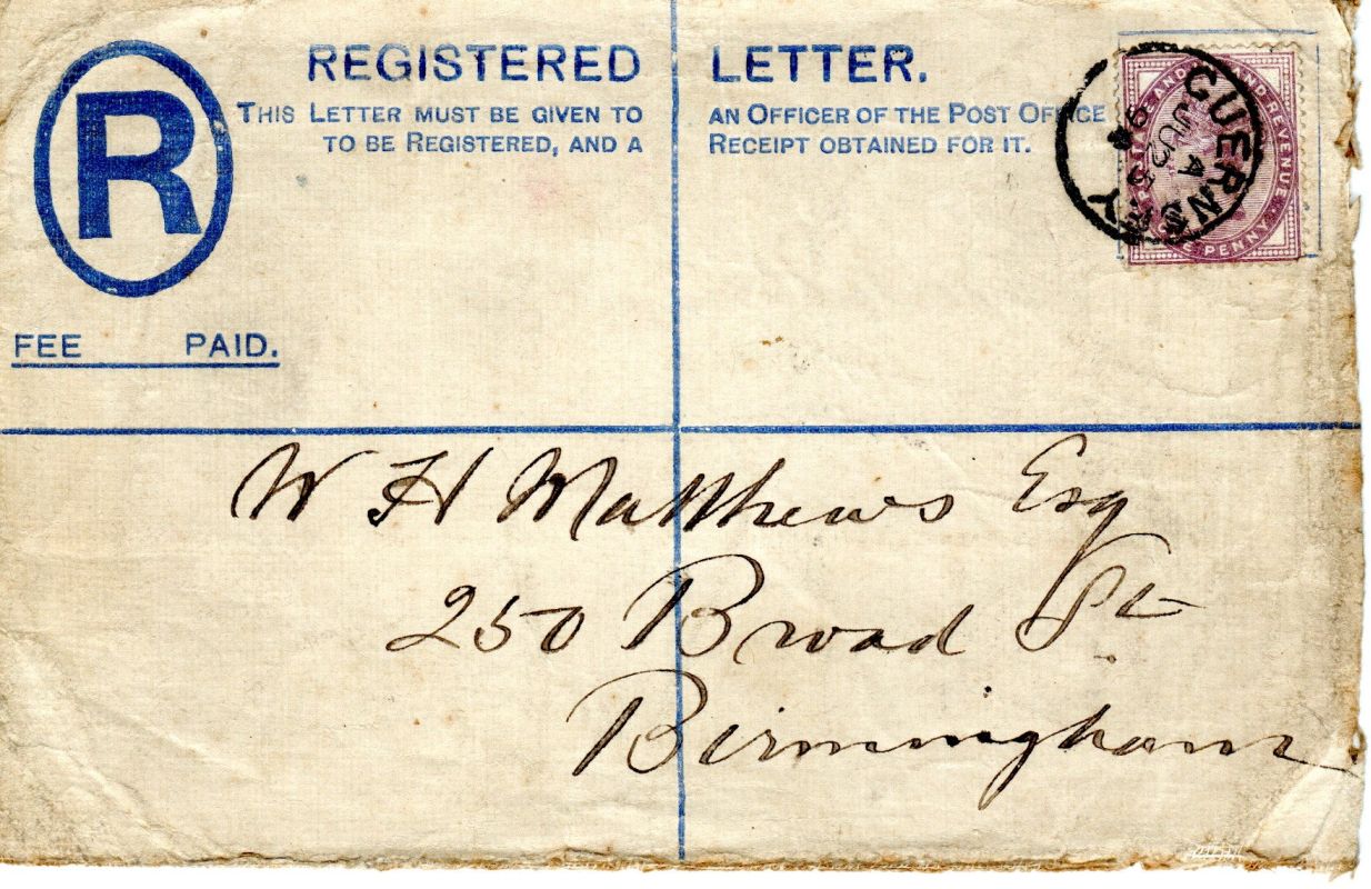 | 51 | GUERNSEY - 1894 QV registered postal stationery envelope addressed to Birmingham with a 1d lilac cancelled by a Guernsey single circle on JU 25 1894. On the reverse is an embossed QV 2d registration stamp and an oval Birmingham arrival mark. These registered covers are regarded as quite scarce. | 40.00 | 40.00 | |