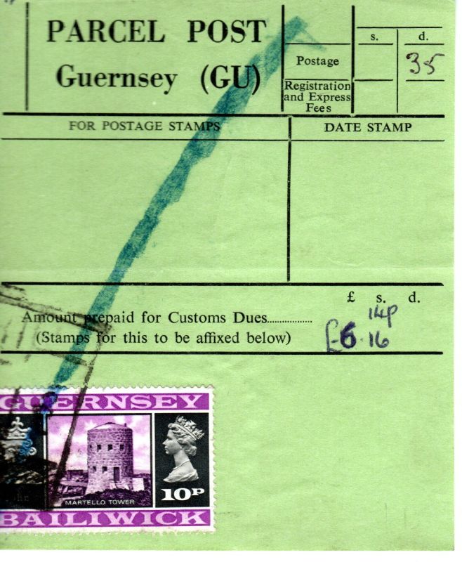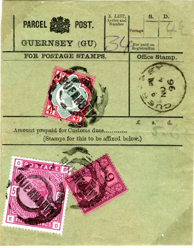 | 53 | GUERNSEY - 1896. Green Parcel Post Label used for prepaid Customs Duty. Single circle date stamp Guernsey No 4 96 (9pm). With 4½d stamp for postage (SG206), a 5/- (SG181) and 6d (SG208) for the custom duty each cancelled with a san-serif Parcel Cancel. Excellent condition. | 300.00 | 300.00 | |
