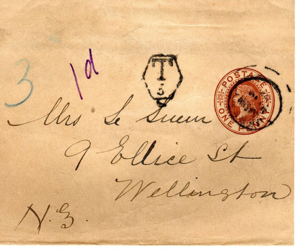 | 54 | JERSEY - 1897 1d Brown wrapper to New Zealand cancelled by a Jersey single circle for MR 10 1897 but underpaid and shows a London hexagonal “T” mark and 1d in manuscript. | 45.00 | 45.00 | |