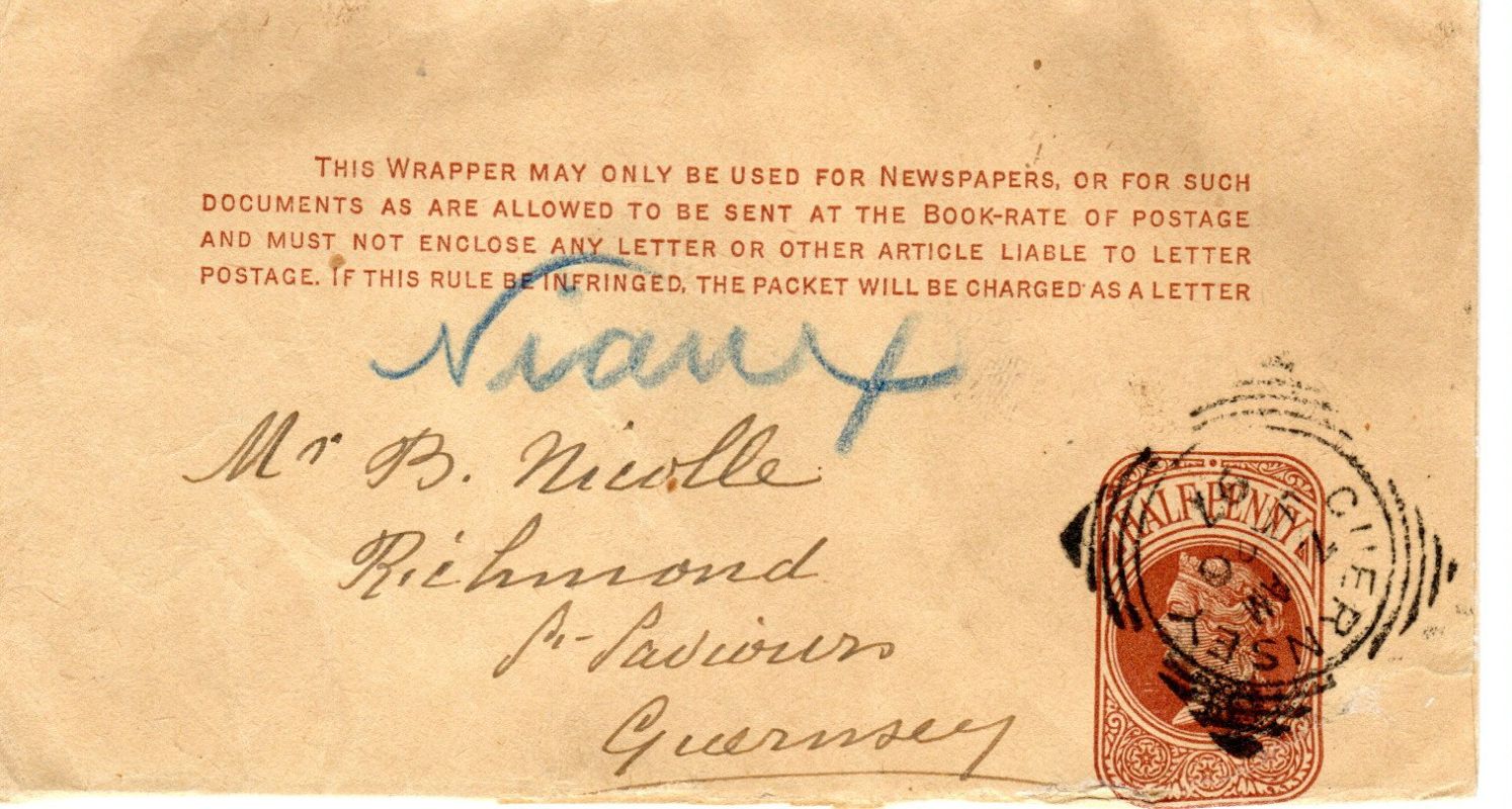 | 55 | GUERNSEY - 1897 ½d brown Newspaper wrapper addressed locally and cancelled by a Guernsey squared circle. | 15.00 | 15.00 | |