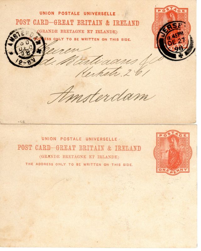 | 56 | JERSEY - A pair of UPU 1d red postcards, one mint and one used to Amsterdam cancelled by Jersey double circle on DE 27 1898. The mint card shows the vermilion shade. | 15.00 | 13.50 | |