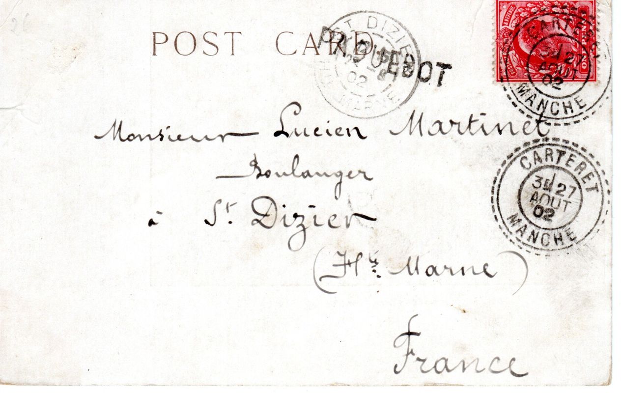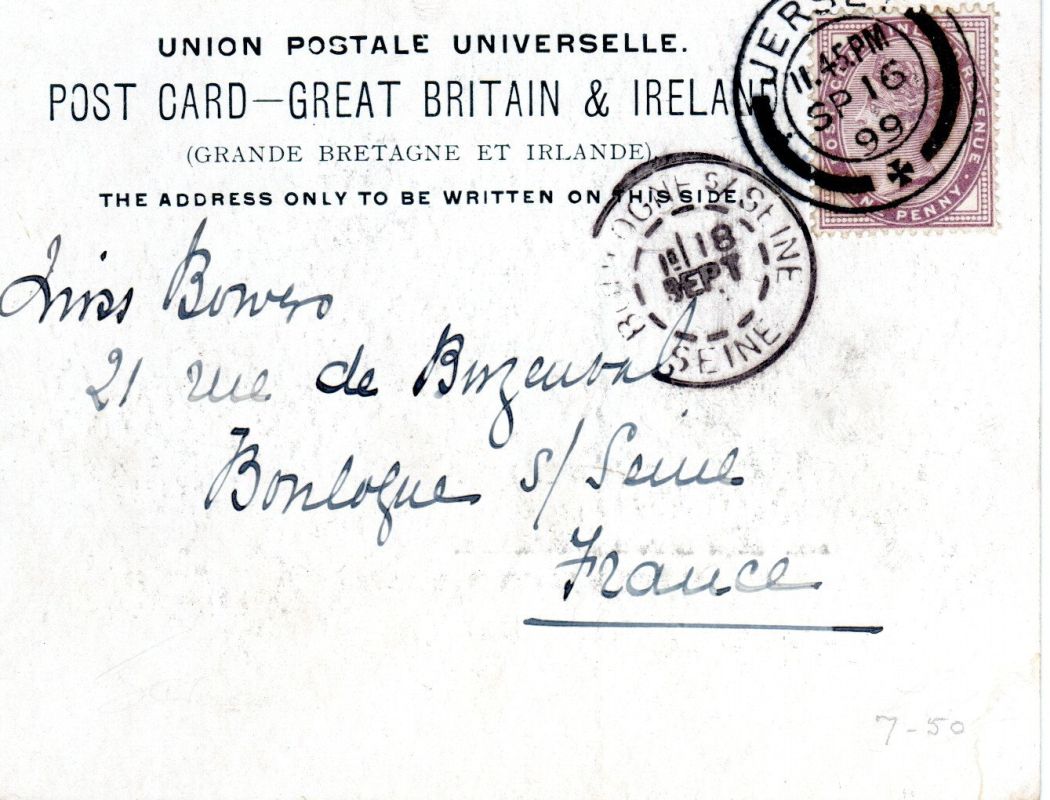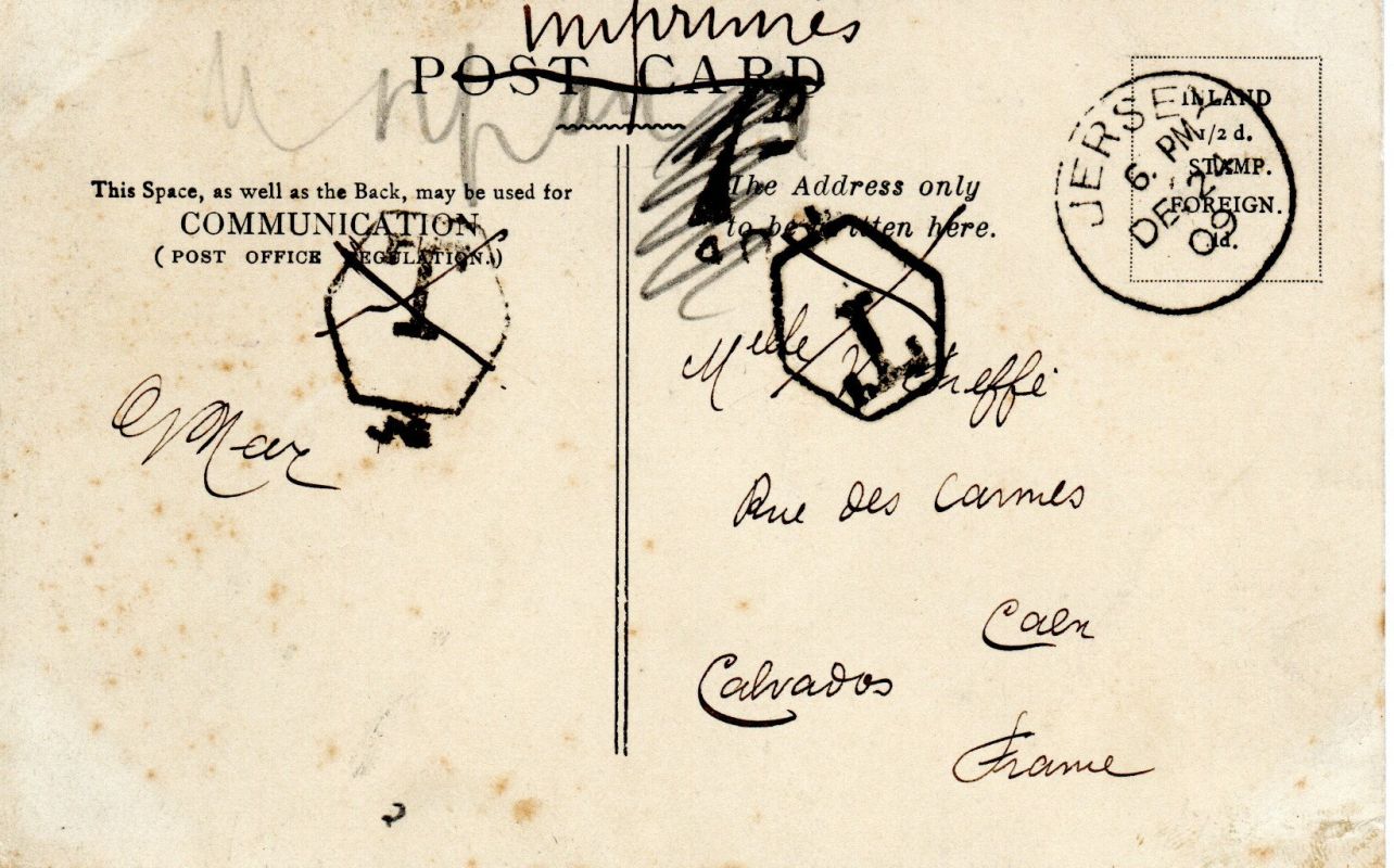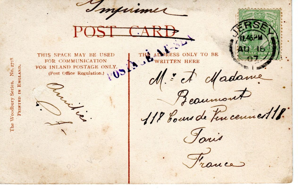 | 88 | JERSEY - 1909 Postcard to Jersey with French 10c stamp cancelled by a very good Jersey/France/MB “moveable box” on MY 28 1909. | 50.00 | 50.00 | |