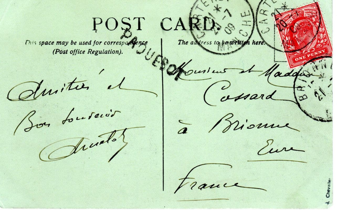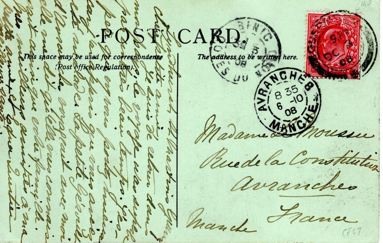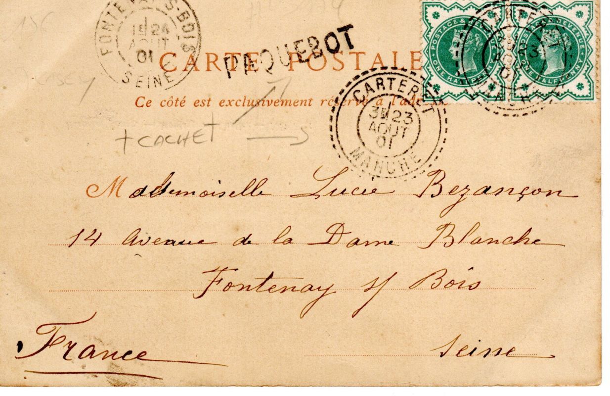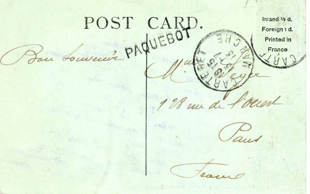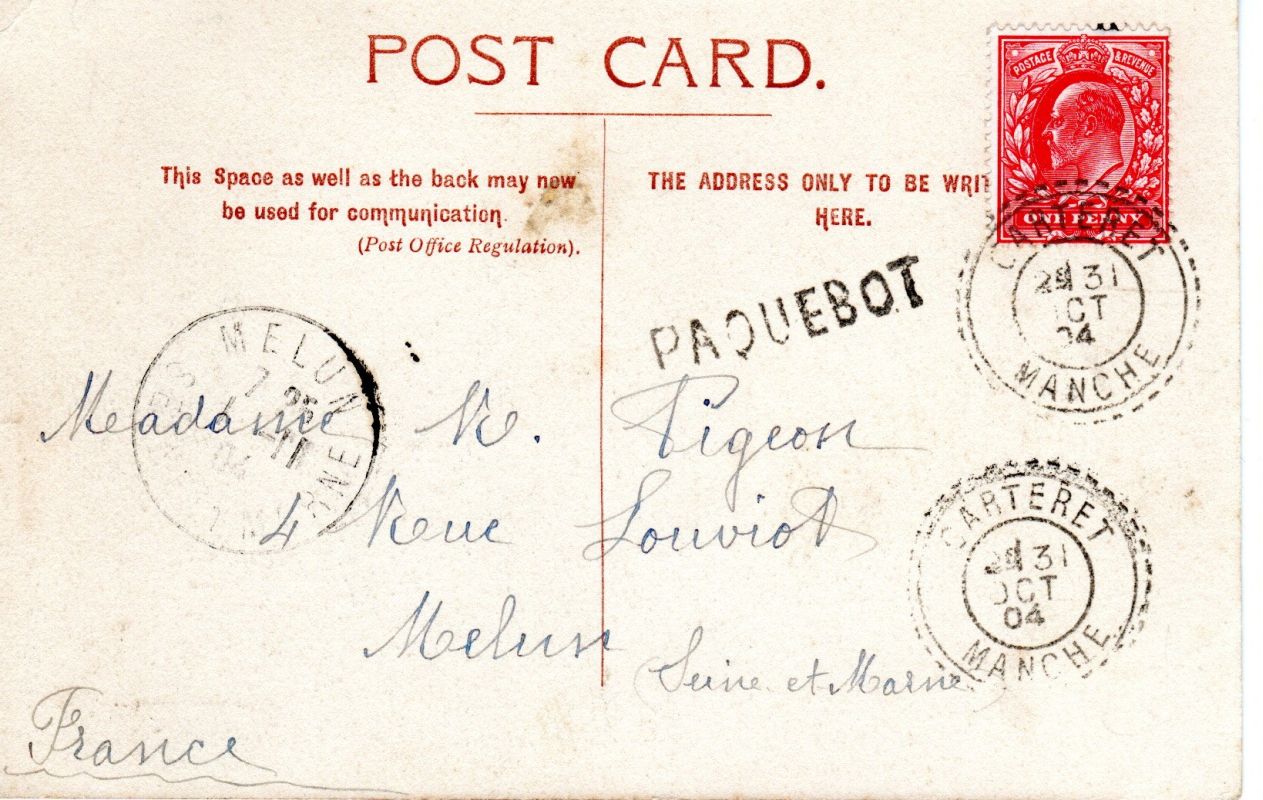 | 86 | PAQUEBOT - 1909 Postcard to France with KEVII 1d cancelled by a Type II CARTERET single circle on the 20 July 1909 together with a PAQUEBOT mark of the French omnibus Type. A nice item. | 60.00 | | |