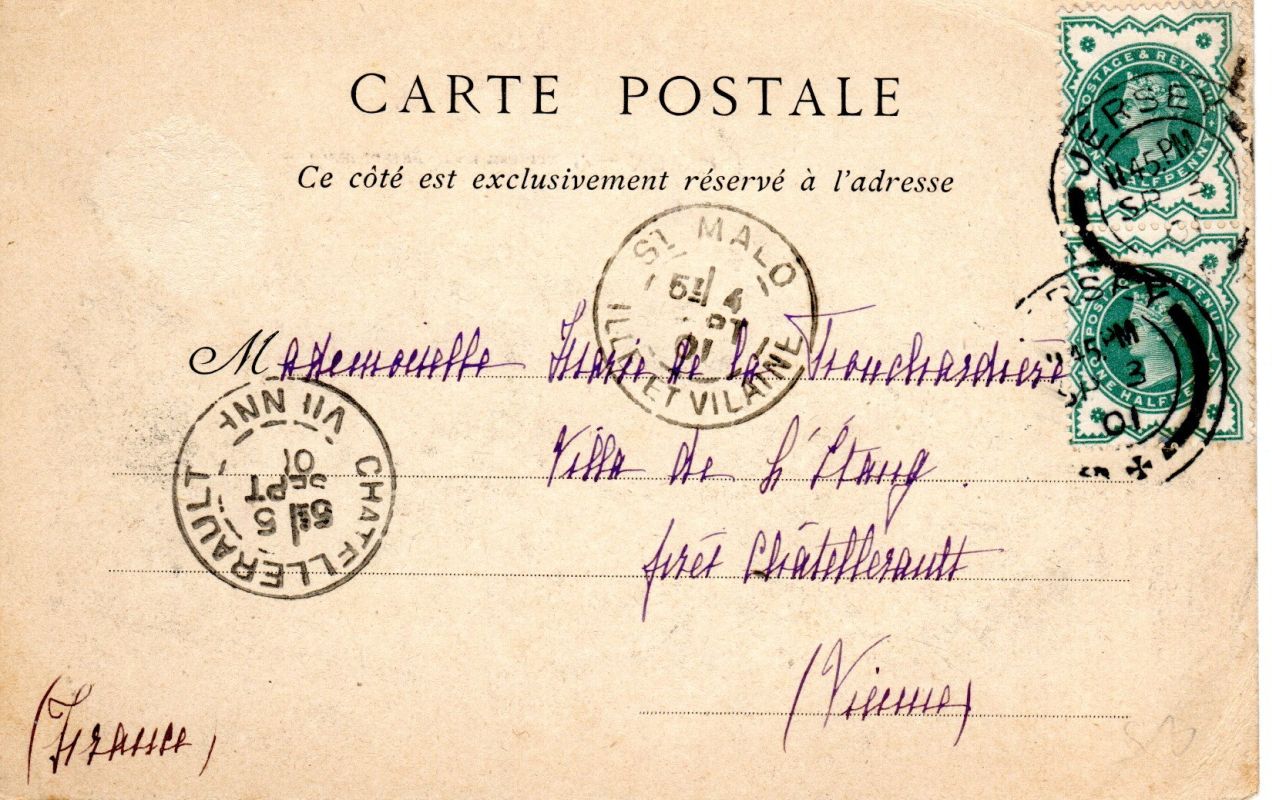 | 63 | JERSEY - 1901 Postcard to France. With 2x ½d QV stamps cancelled with Jersey double circledatestamp and St Malo and Chatellerault receiving date stamps. | 15.00 | | |