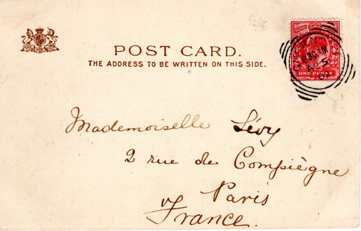 | 67 | GUERNSEY - 1902 Postcard to Paris. 1d rate. With Guernsey squared circle datestamp with time code | 5.00 | 4.00 | |