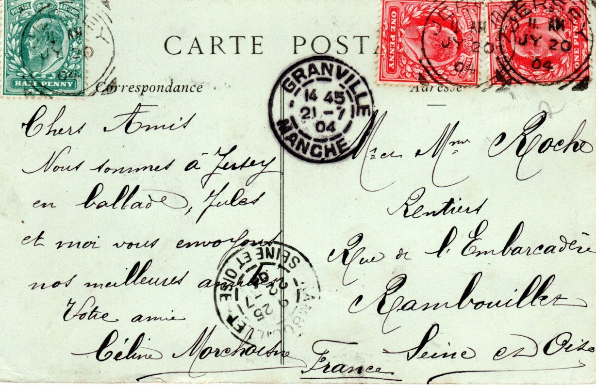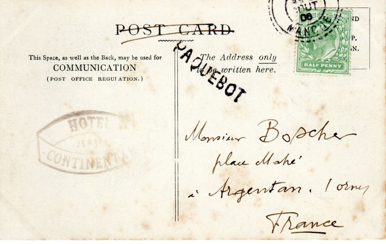 | 74 | JERSEY - 1906 Postcard to France. With oval hotel cachet - 'HOTEL CONTINENTAL/ JERSEY'. With KEVII stamp cancelled with fine CARTERET/ MANCHE' datestamp. With French PAQUEBOT handstamp alongside | 20.00 | 20.00 | |