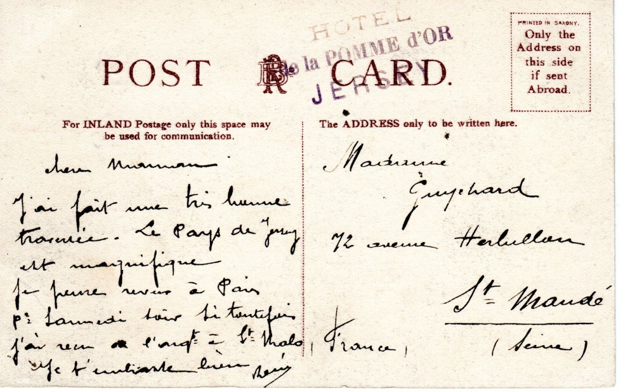 | 68 | JERSEY - 1904 Postcard sent at 1d rate to France with hotel cachet - HOTEL /de la POMME d'OR/ JERSEY | 6.00 | 9.00 | |