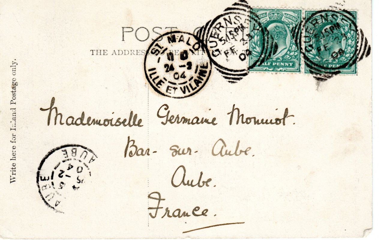 | 69 | GUERNSEY - 1904 postcard to Aube, France with 2 x KEVII ½d stamps cancelled by Guernsey squared circles on FE 23 1904. Also shown is a very good St. Malo double circle and Aube arrival mark. | 5.00 | 5.00 | |