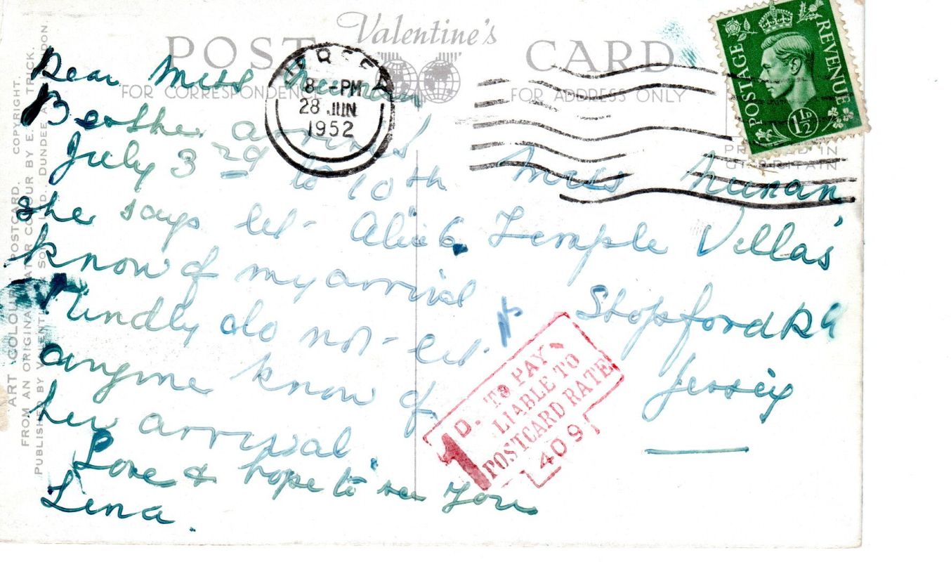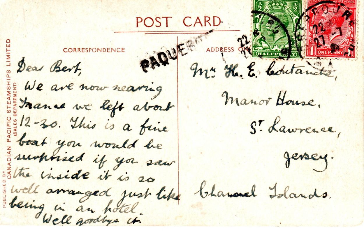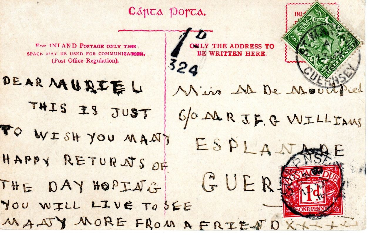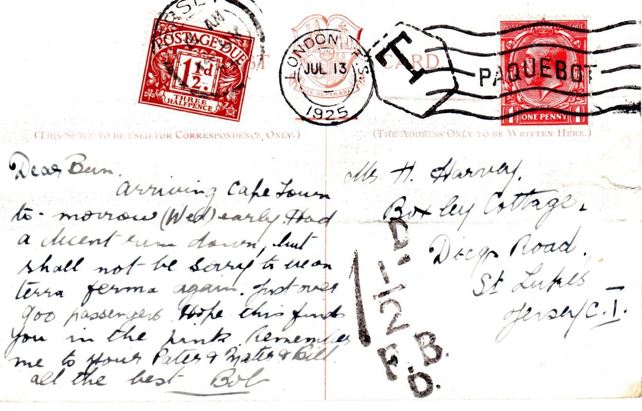 | 75 | JERSEY - 1907 postcard to France with a KGV ½d cancelled with a Jersey DRC "POSTAGE-AT-SEA" cachet in purple. There are no other markings. | 20.00 | 21.00 | |