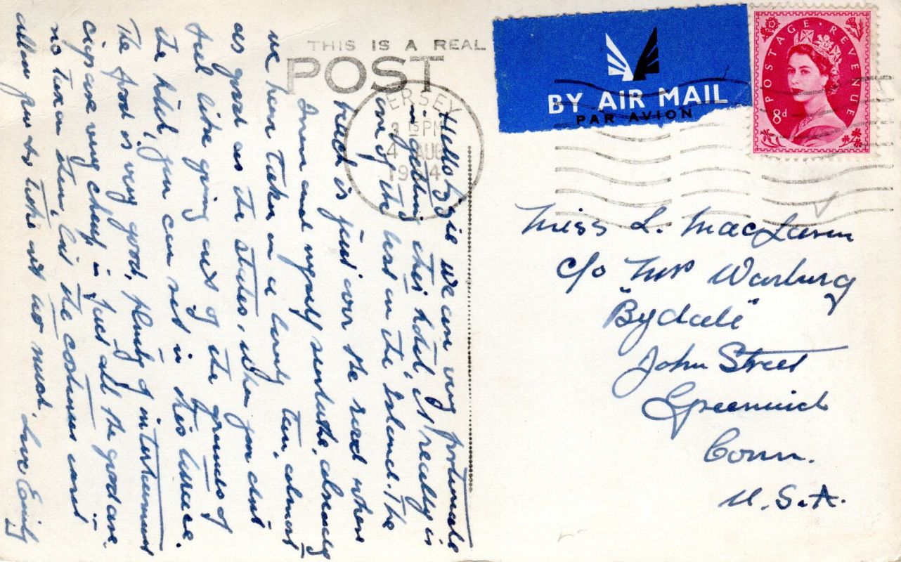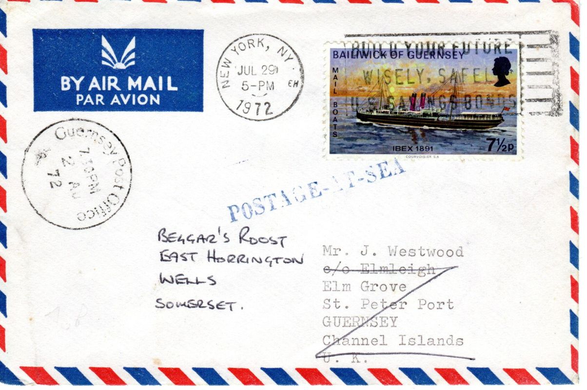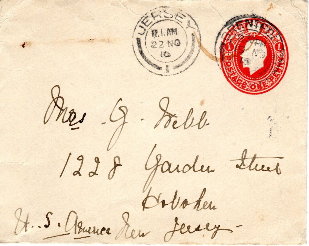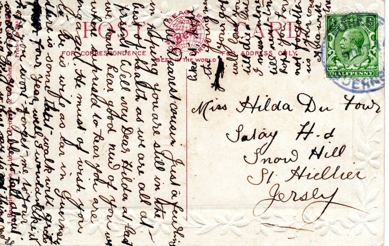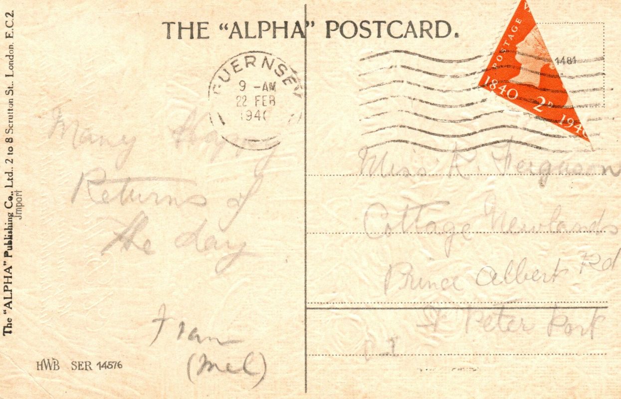 | 75 | JERSEY - 1907 postcard to France with a KGV ½d cancelled with a Jersey DRC "POSTAGE-AT-SEA" cachet in purple. There are no other markings. | 20.00 | 21.00 | |