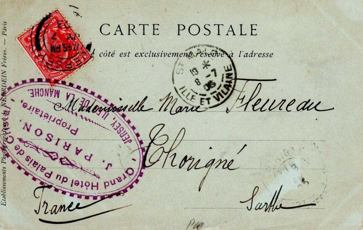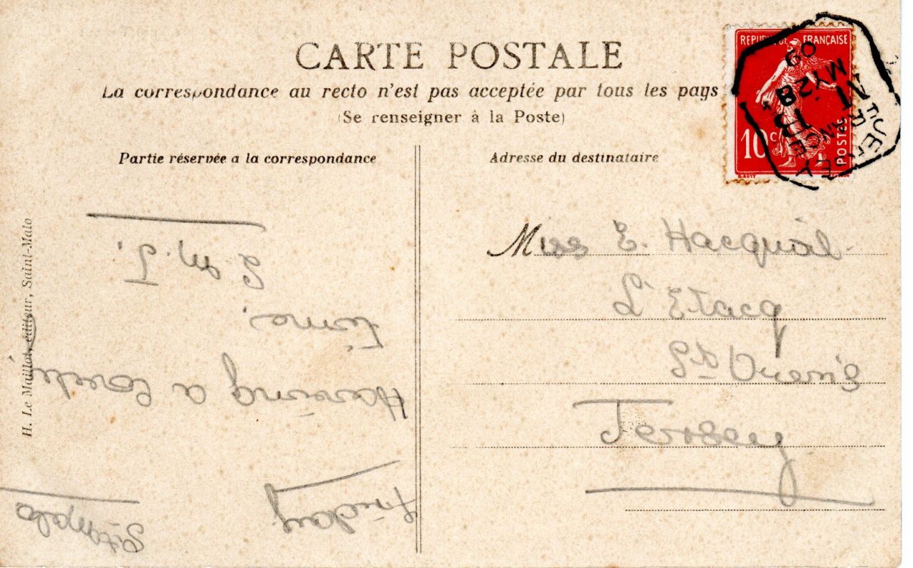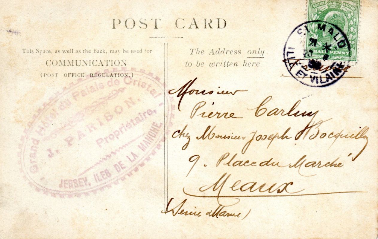 | 78 | JERSEY - 1908(?) Postcard to France with KEVII stamp cancelled with 'ST MALO / ILLE ET VILAINE ' datestamp. With oval 'Grand Hotel du Palais de Cristal' cachet | 30.00 | 30.00 | |