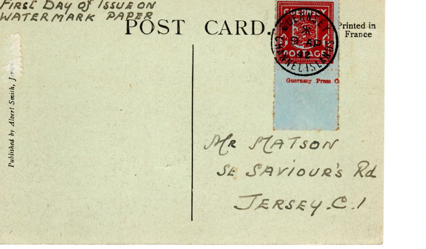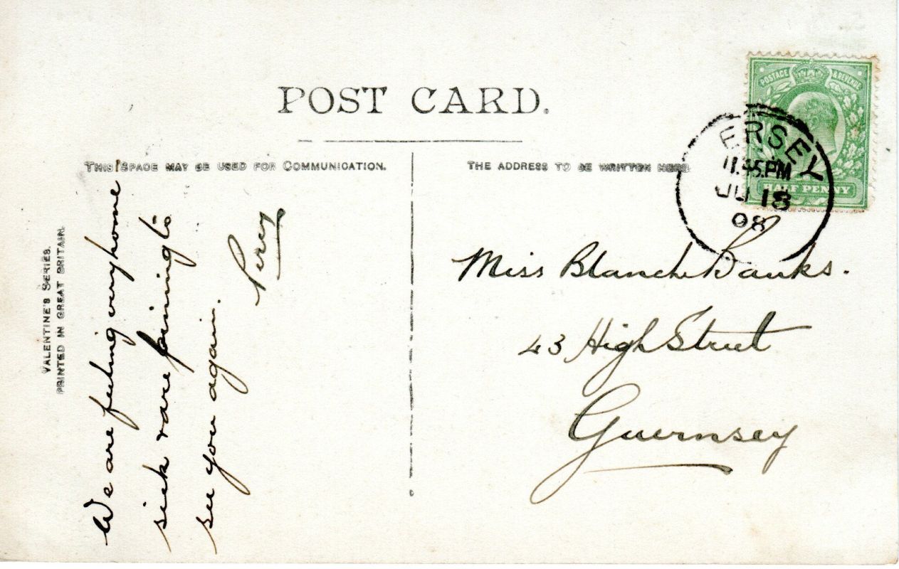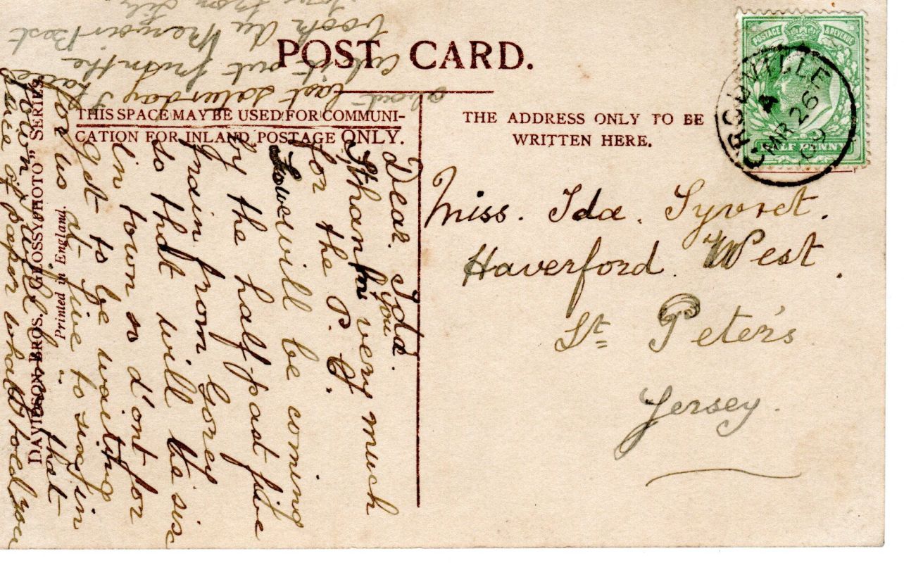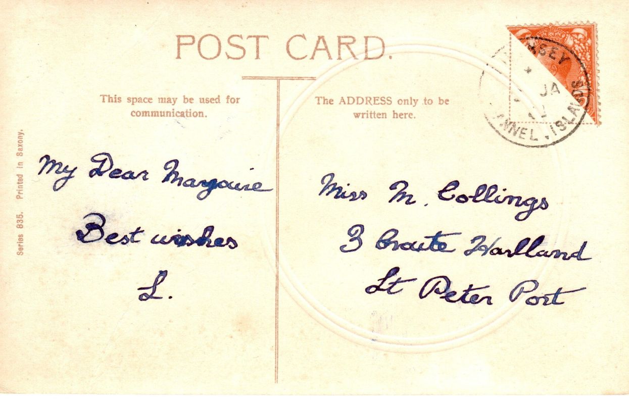 | 76 | JERSEY - 1908 Postcard to Guernsey. With ½d KEVII stamp with Jersey cds (JC56). The 'J' is missing | 10.00 | 10.00 | |