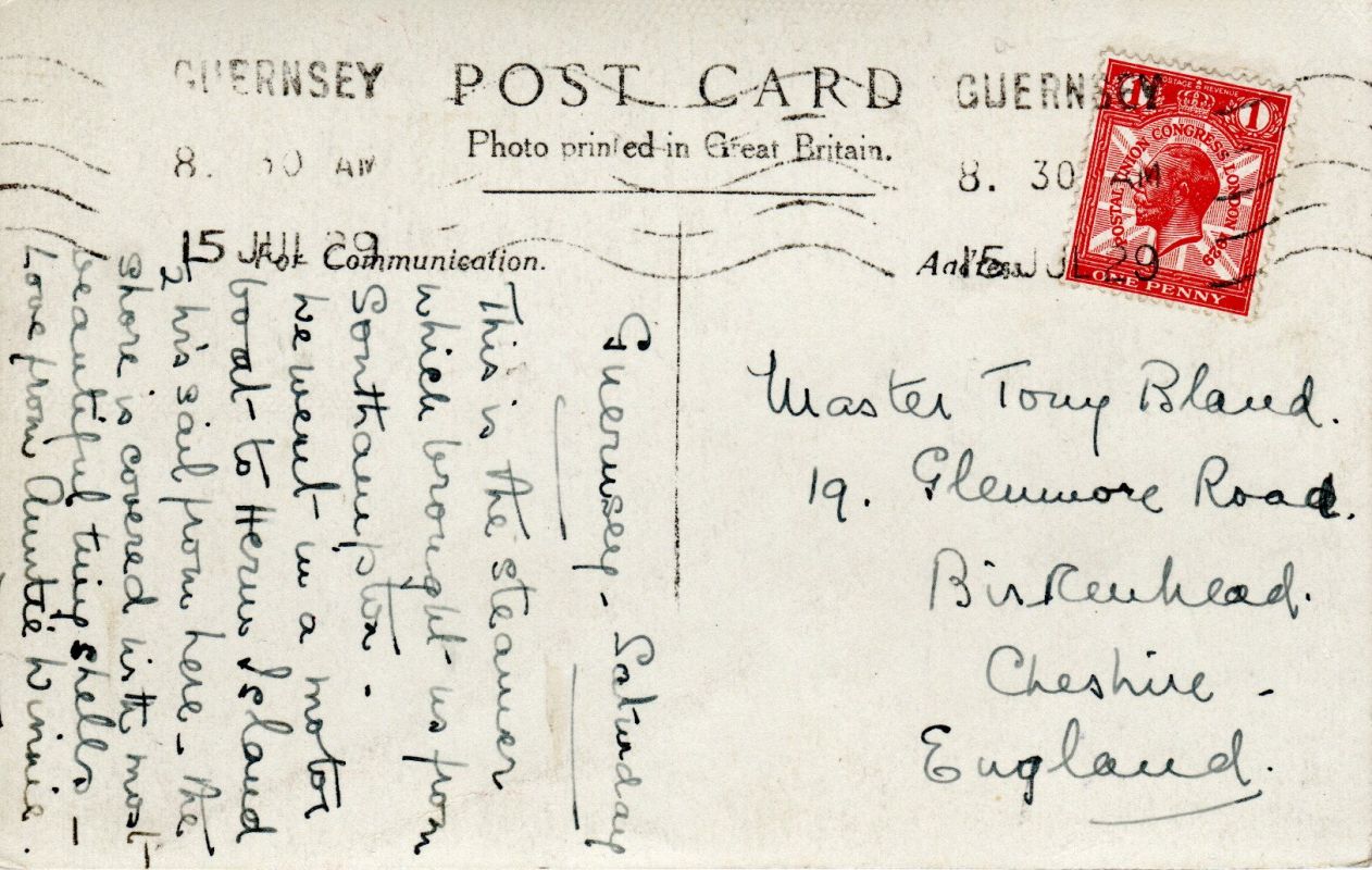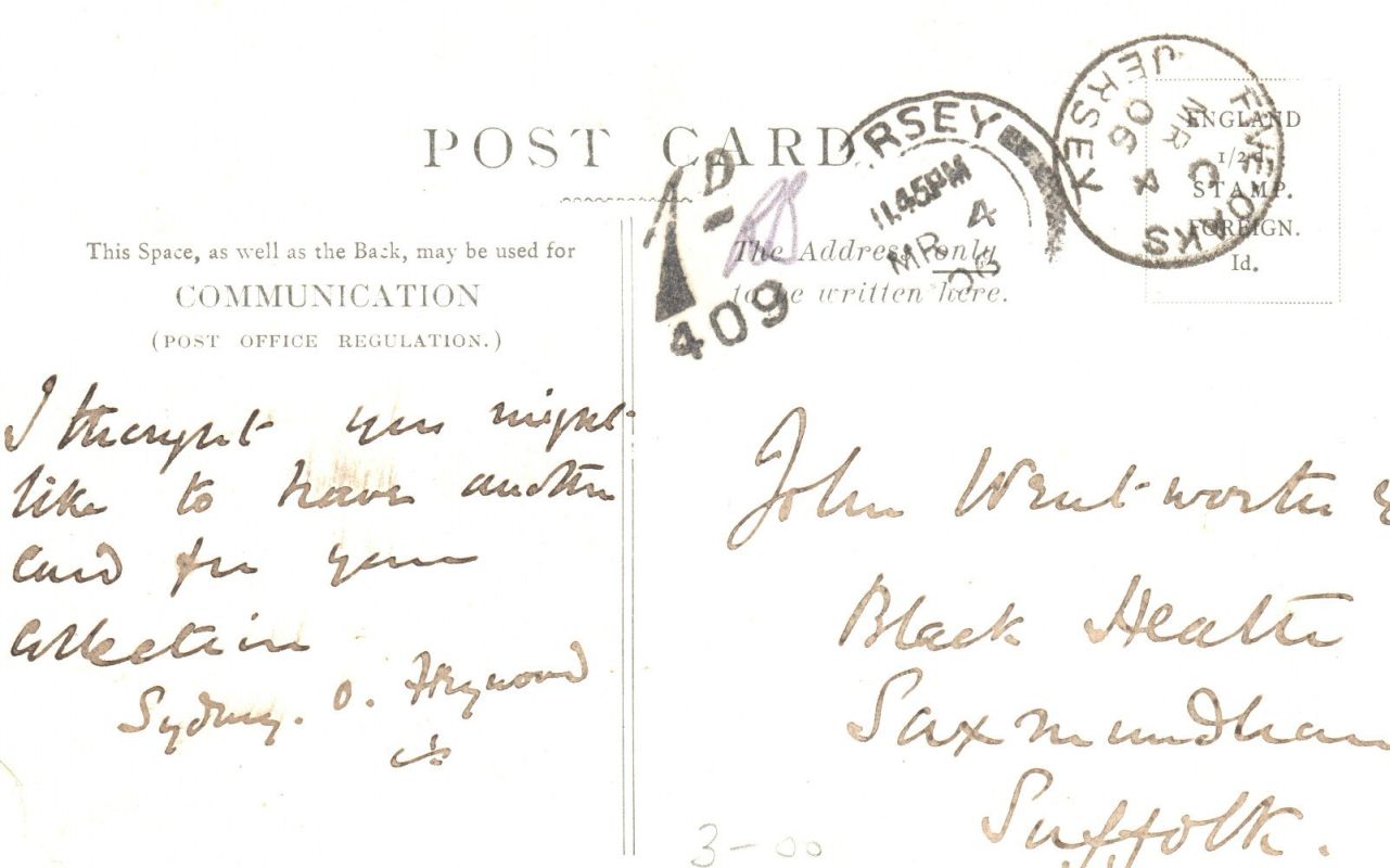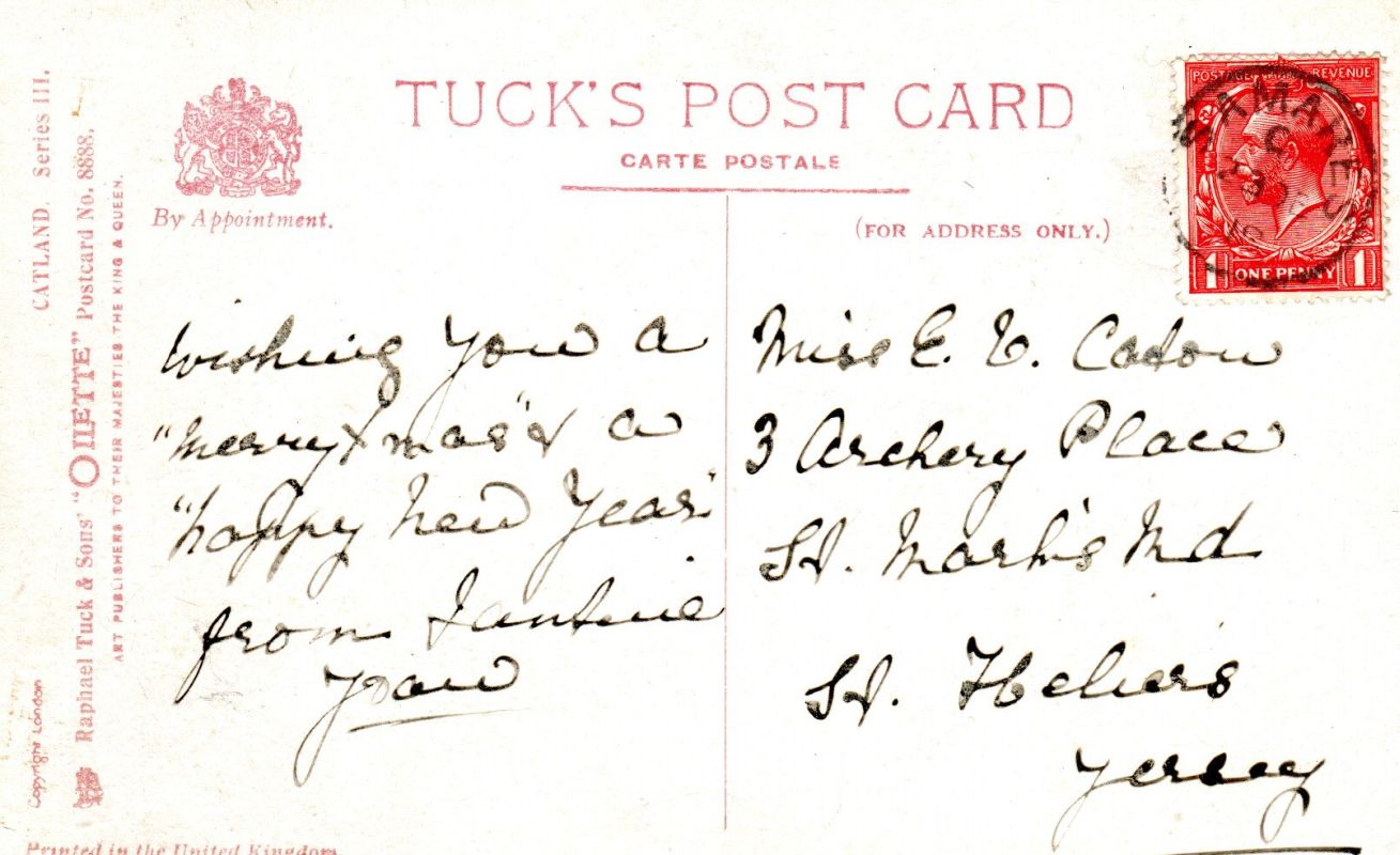 | 76 | JERSEY - 1908 Postcard to Guernsey. With ½d KEVII stamp with Jersey cds (JC56). The 'J' is missing | 10.00 | 10.00 | |