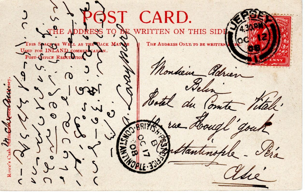 | 77 | JERSEY - 1908 Postcard to Constantinople. With 1d KGV stamp cancelled with a Jersey DRC (JC62) and a very fine British Post Office Constantinople receiving datestamp OC 17 08 | 12.00 | 16.00 | |