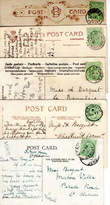 | 80 | JERSEY - Group of 5 KEVII period postcards all used with different Jersey sub Post Office datestamps - Augres, Beaumont, Grouville, St Martins and St. Owens | 14.00 | | |