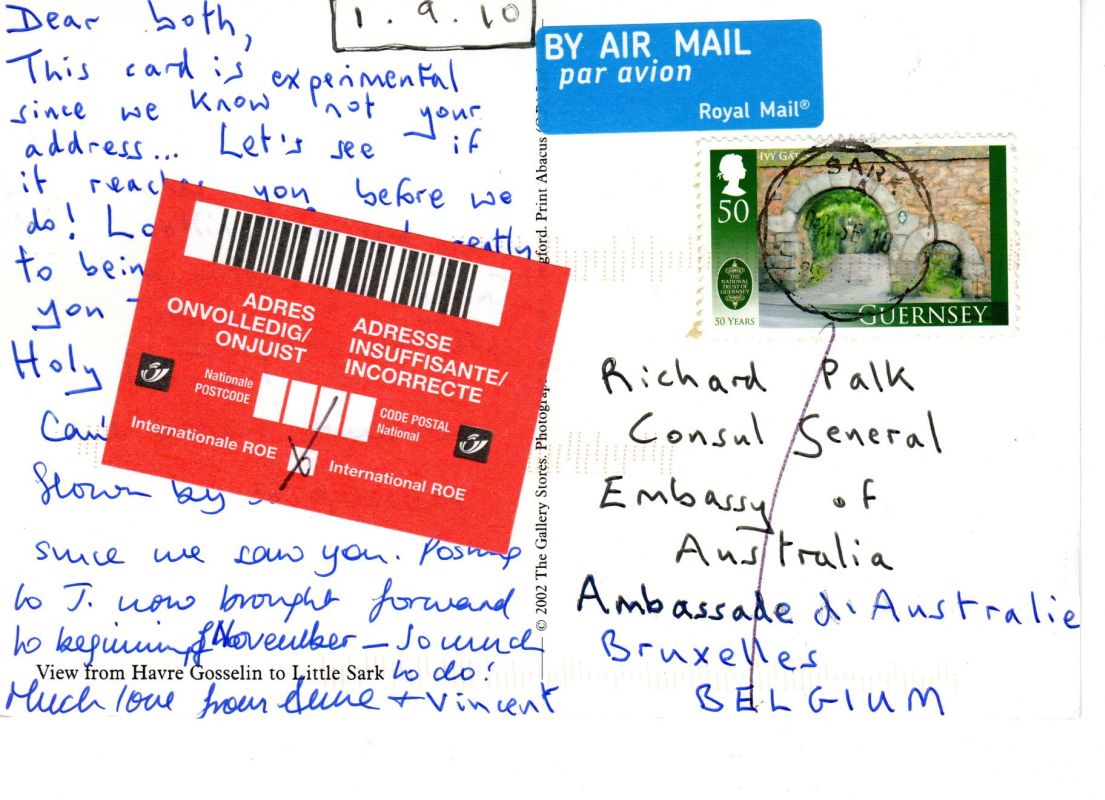 | 90 | SARK - postcard to Brussels with Sark sid dated 02 SE 10. Insufficiently addressed so has a Return to Sender sticker. | 8.00 | 15.00 | |