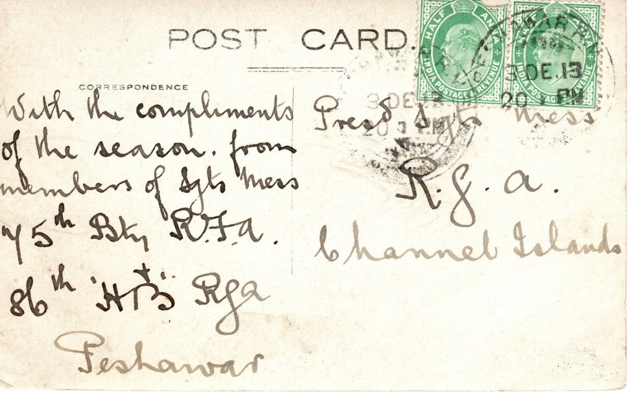 | 92 | GUERNSEY - 1913 Photo postcard from Peshawar, India to the Sergeants Mess of the Royal Guernsey Artillery | 12.00 | 12.00 | |