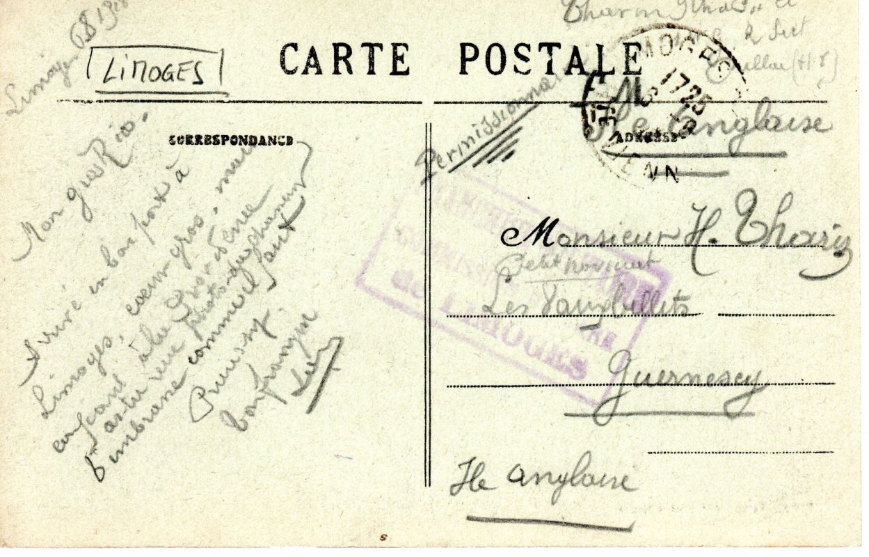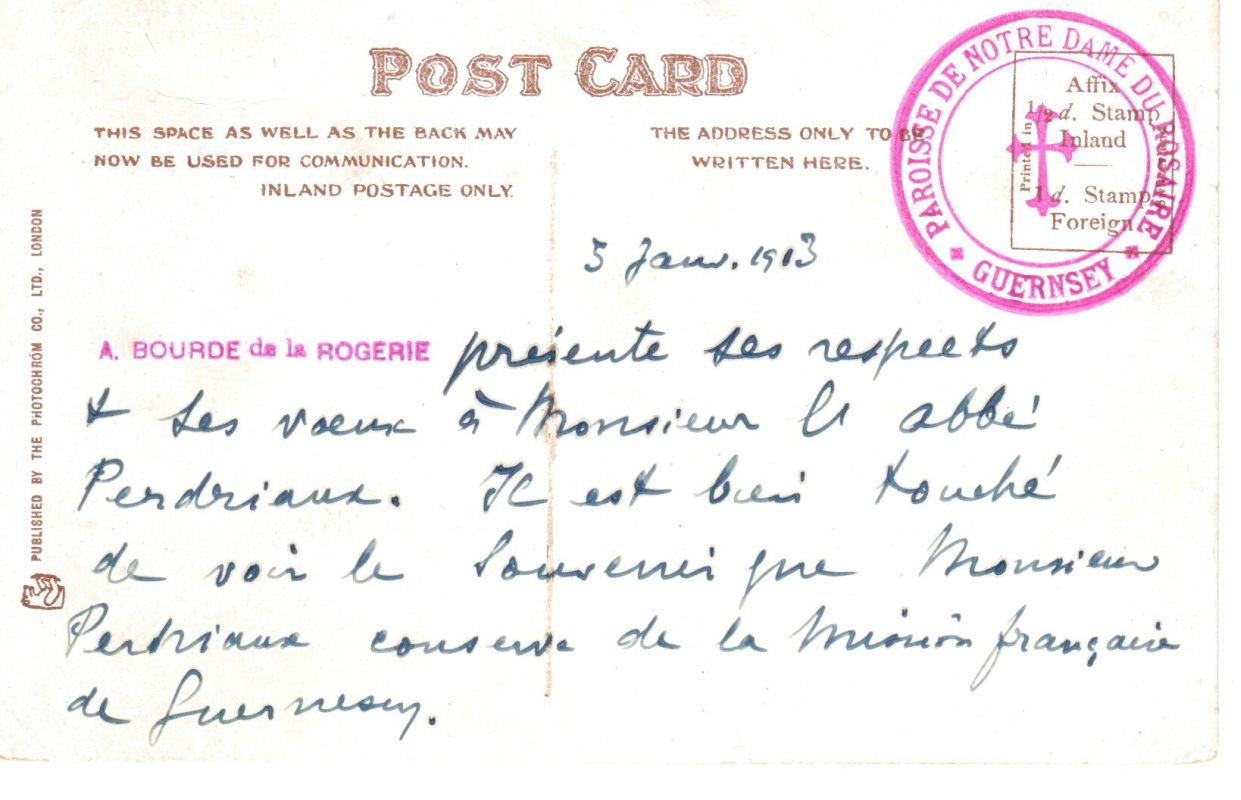 | 679 | GUERNSEY - Gull Rocks. Coloured. Not postally used but with message dates 1913. With large circular cachet in red -'PAROISSE DE NOTRE SAMEDU ROSAIRE/ GUERNSEY' Plus straight line cachet -'A BOURDE de la ROGERIE' | 12.00 | 12.00 | |