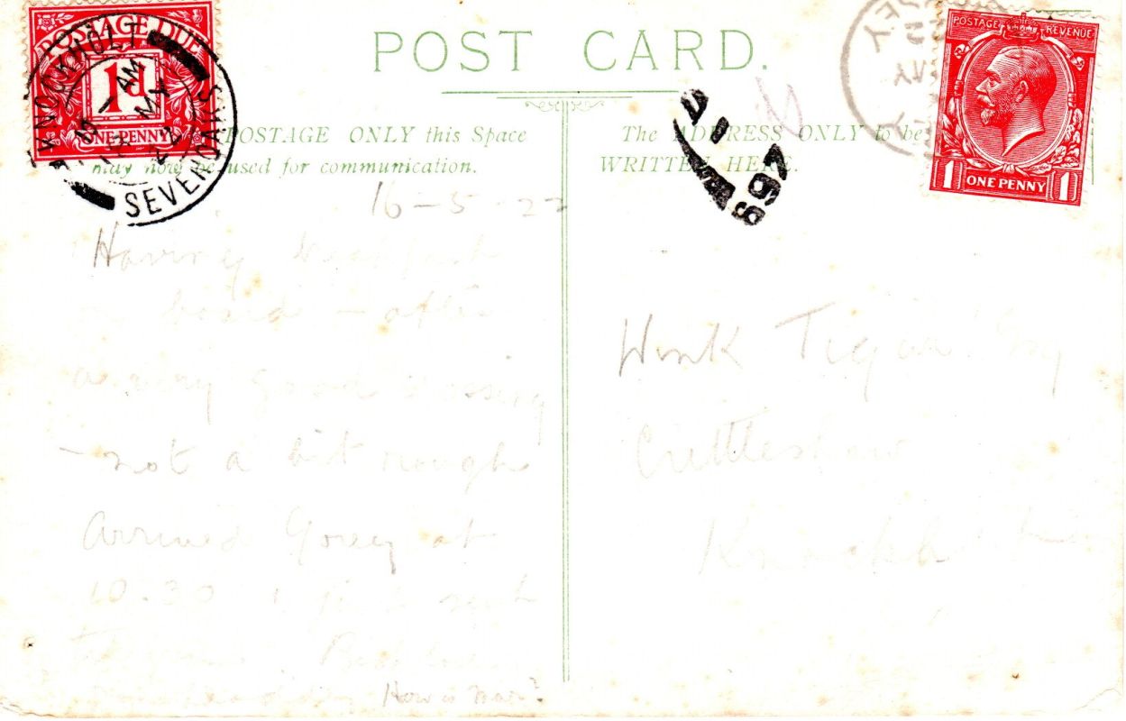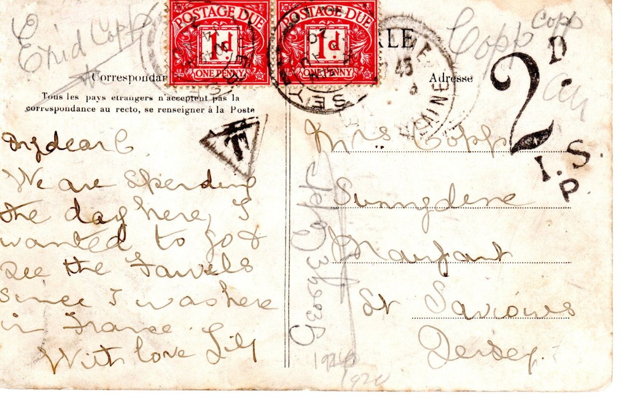 | 720 | JERSEY - 1904 postcard from Five Oaks to Suffolk. No stamp. Postage due mark '1d/409' (Type J101a). Some damage to bottom righ corner. Cat. £30 | 5.00 | 4.00 | |