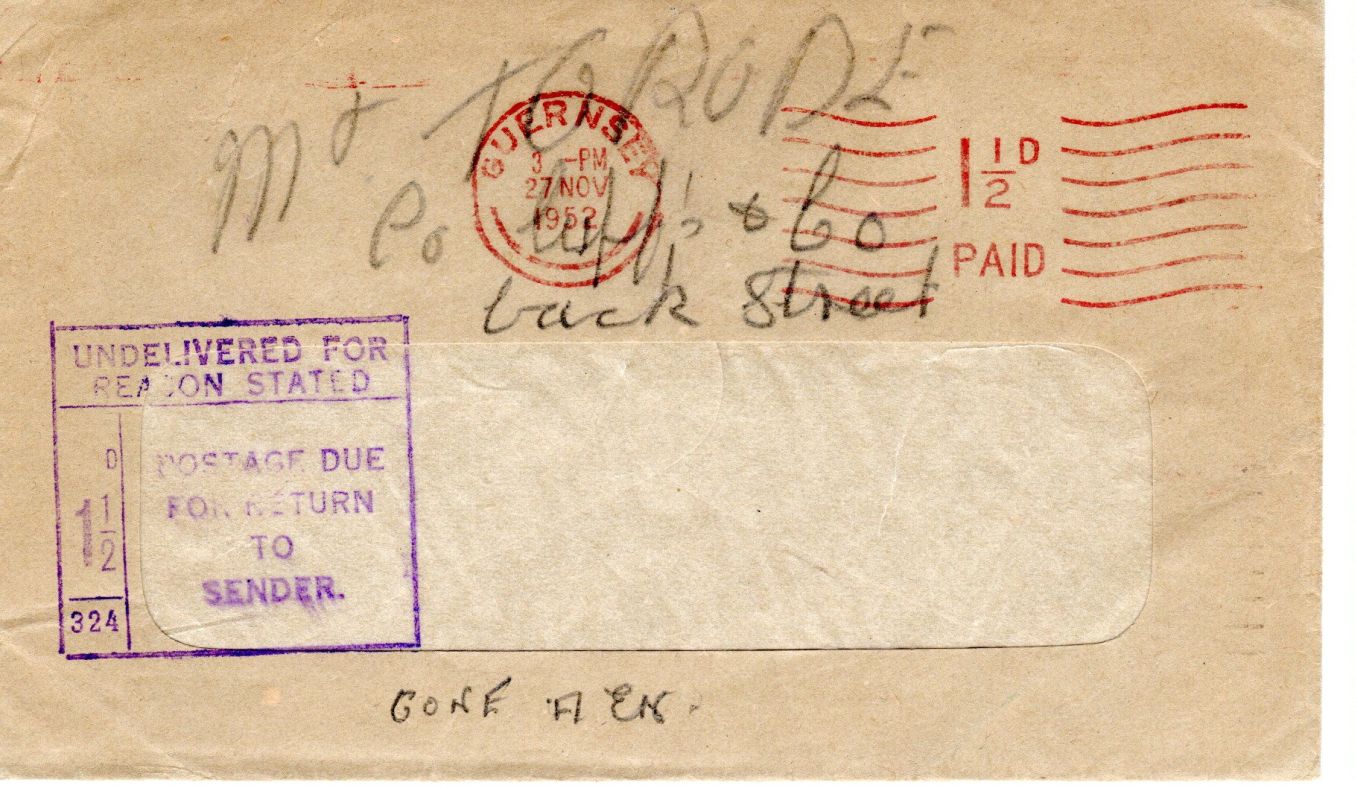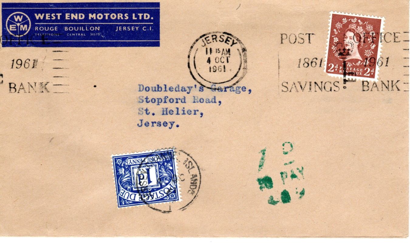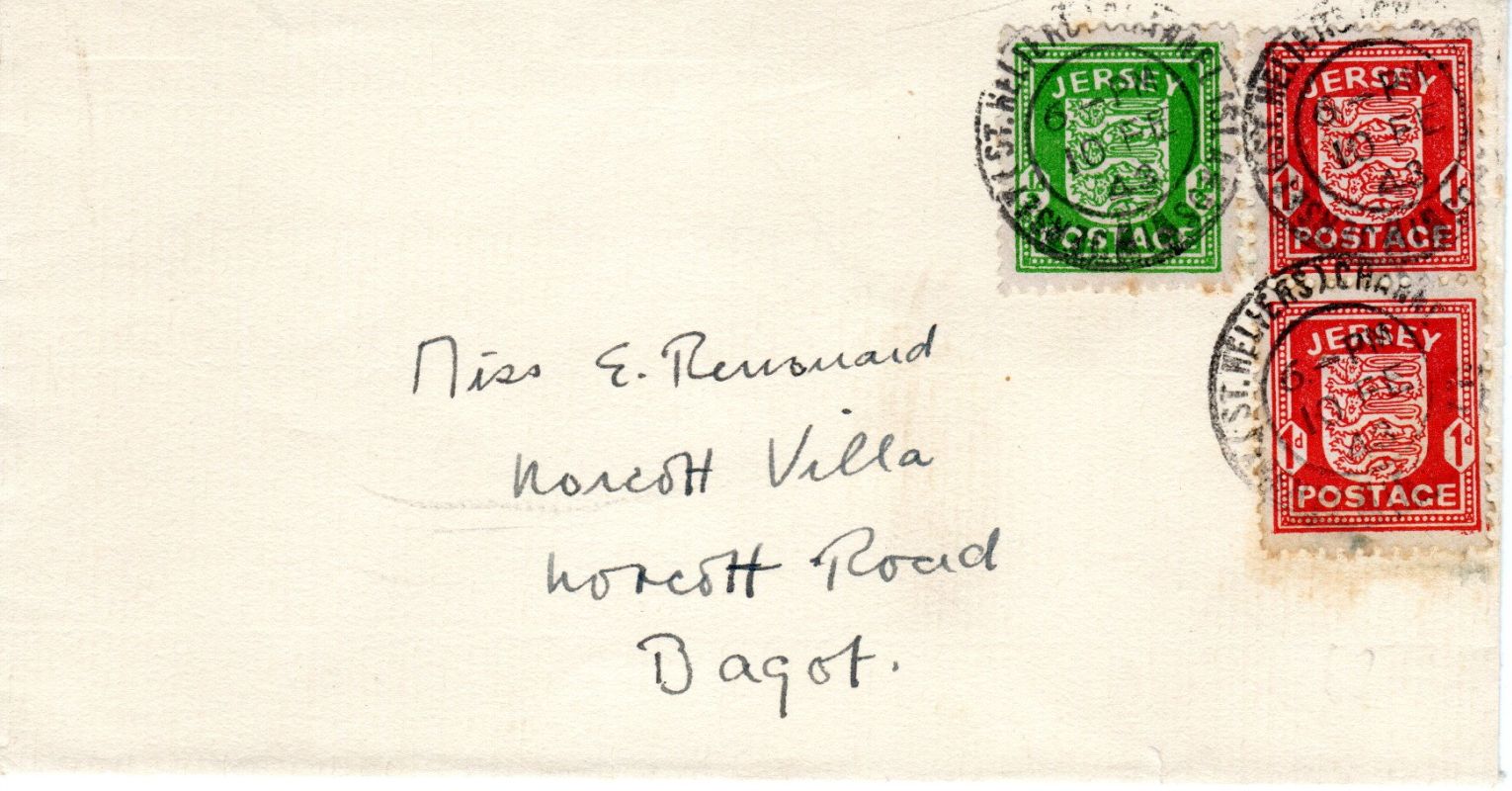 | 721 | JERSEY - 1939 cover used locally. Marked "Gone Away" 'UNDELIVERED FOR / REASON STATED - FOR POSTAGE DUE / FOR RETURN / TO / SENDER - ½d - 409' handstamp (Type J187). ½d postage due on reverse cancelled with St. Helier date stamp. Cat. £50 | 15.00 | 12.00 | |