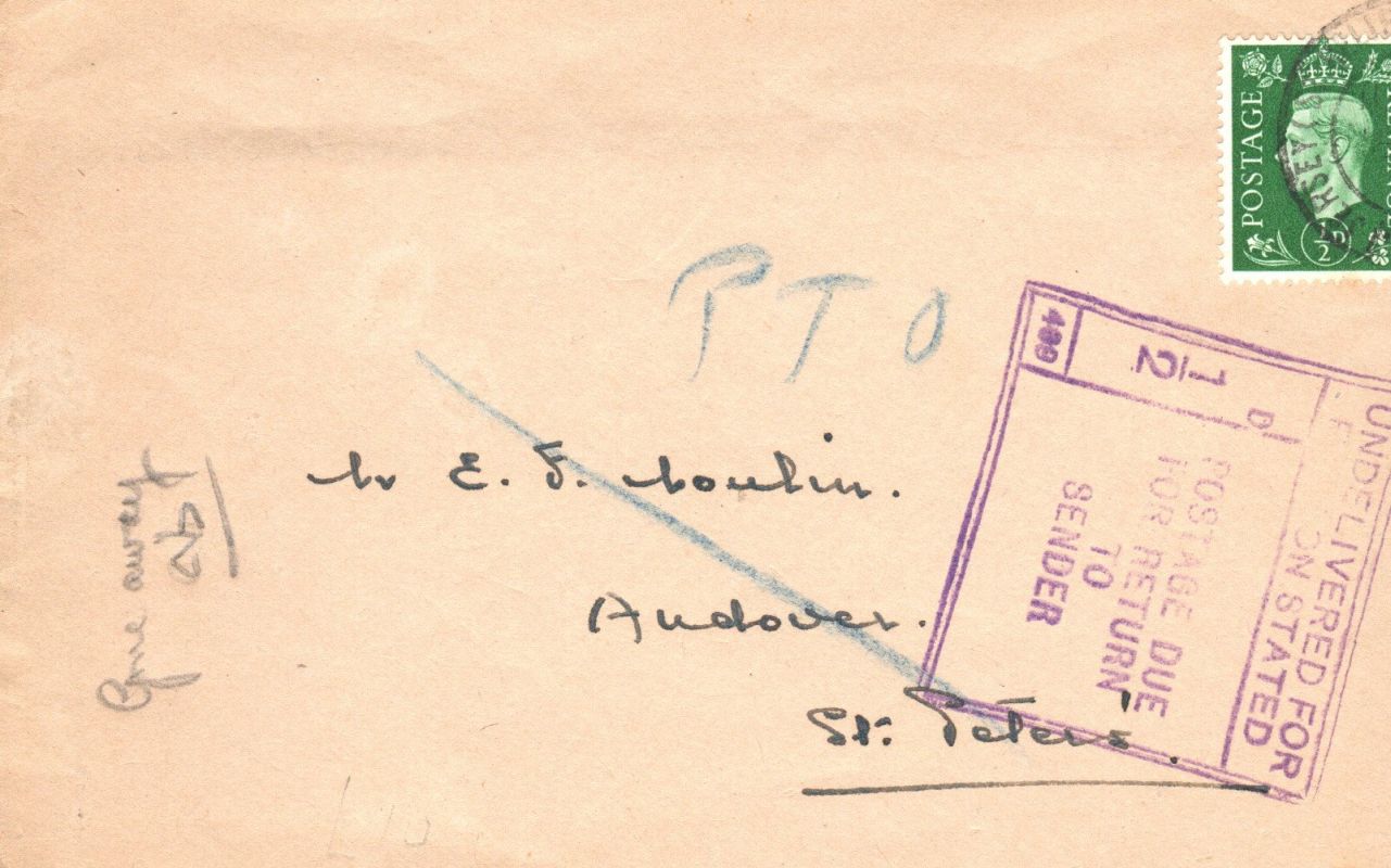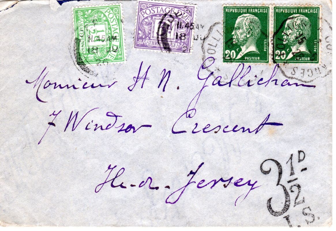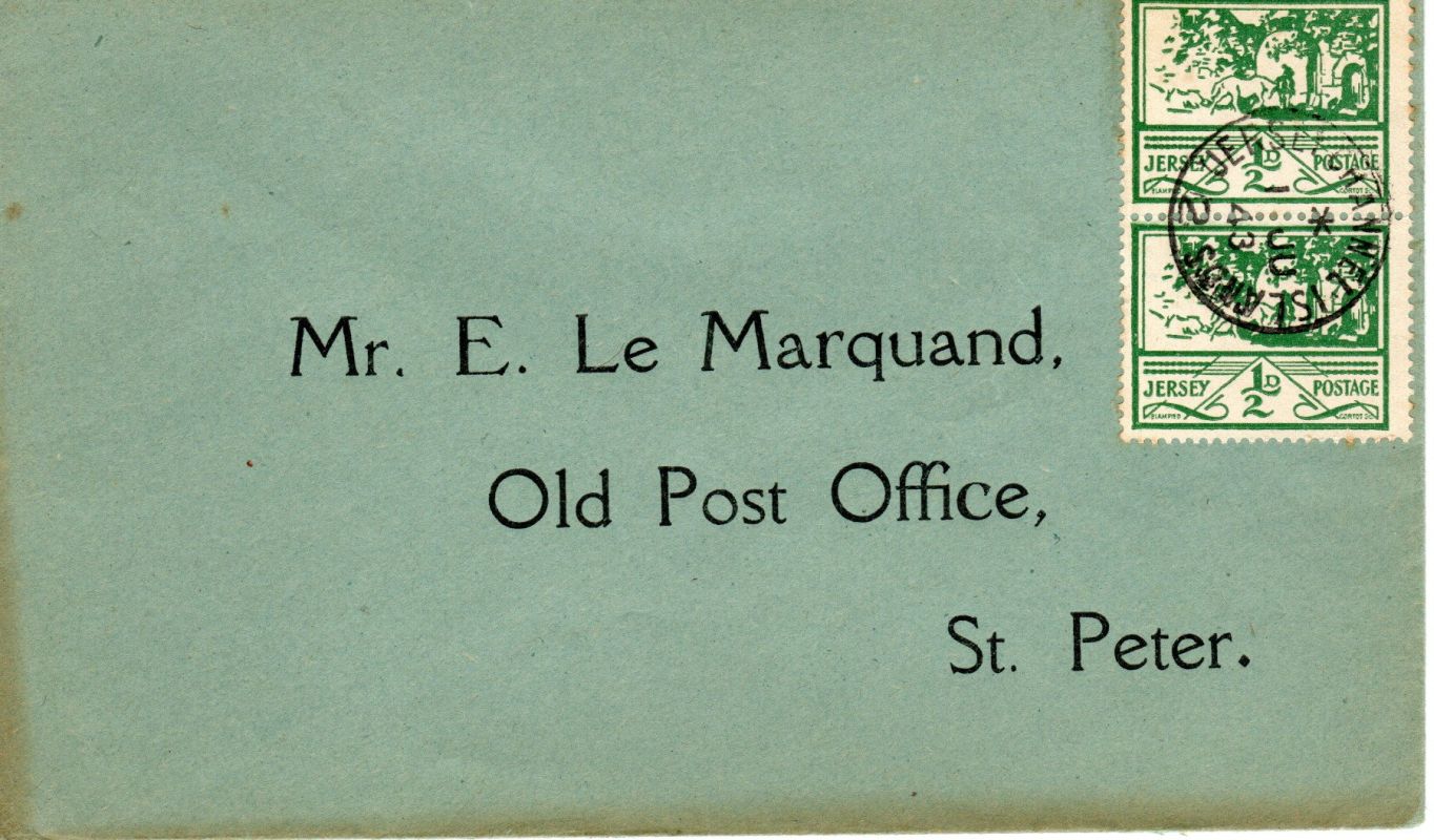 | 721 | JERSEY - 1939 cover used locally. Marked "Gone Away" 'UNDELIVERED FOR / REASON STATED - FOR POSTAGE DUE / FOR RETURN / TO / SENDER - ½d - 409' handstamp (Type J187). ½d postage due on reverse cancelled with St. Helier date stamp. Cat. £50 | 15.00 | 12.00 | |