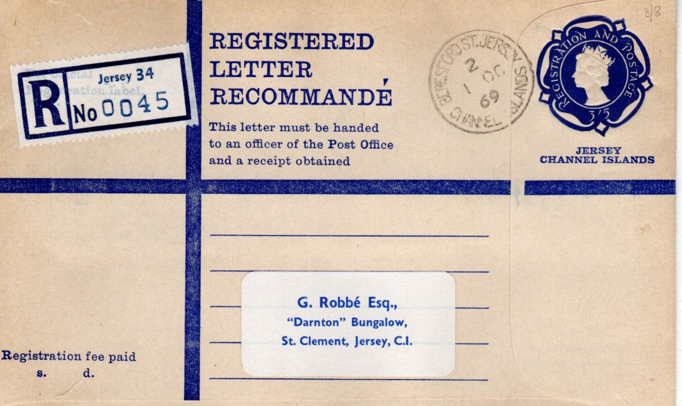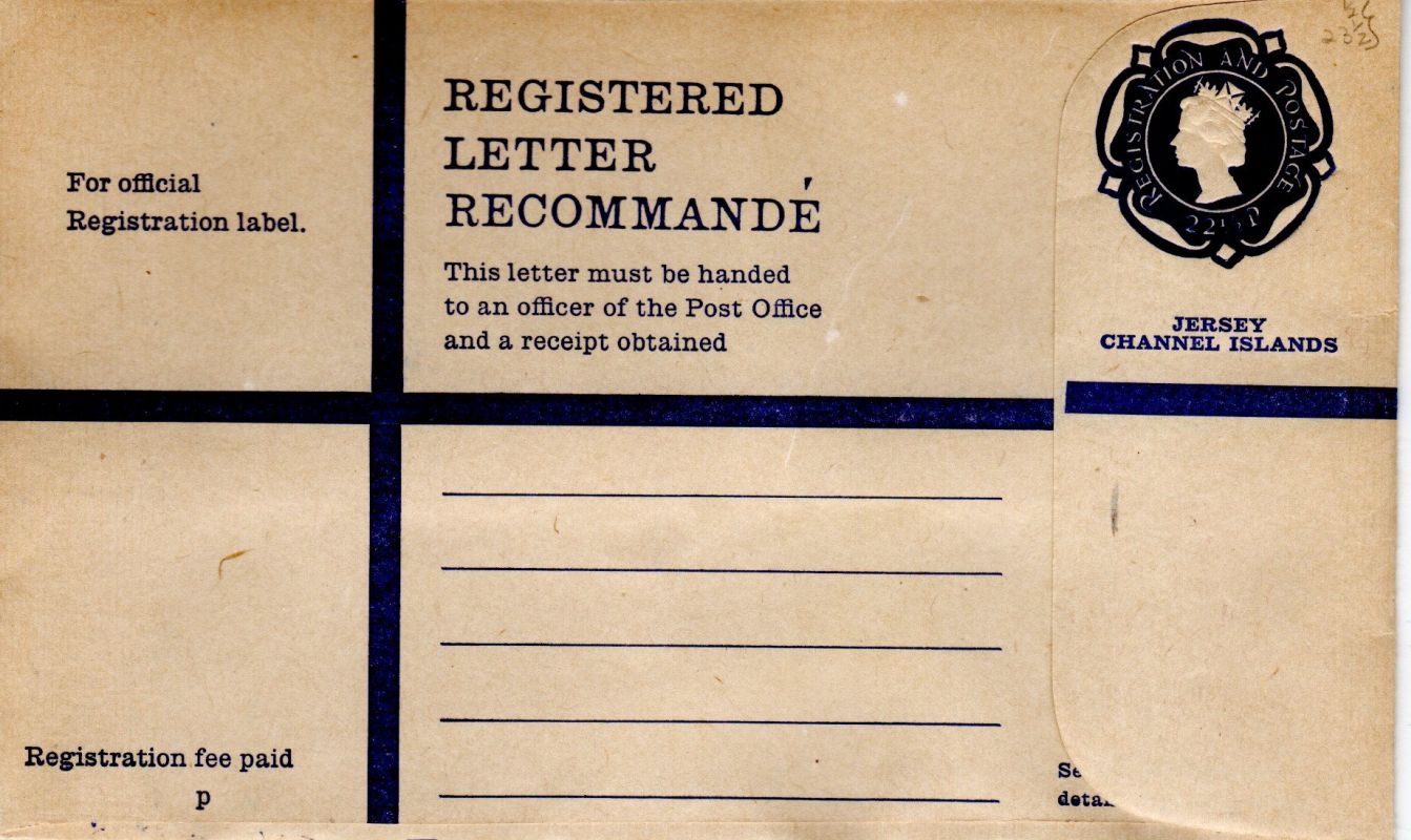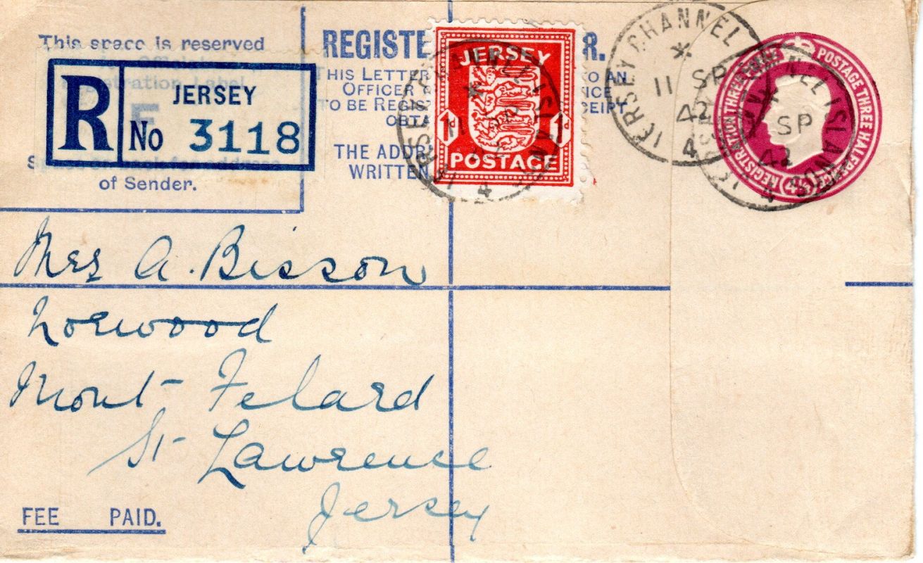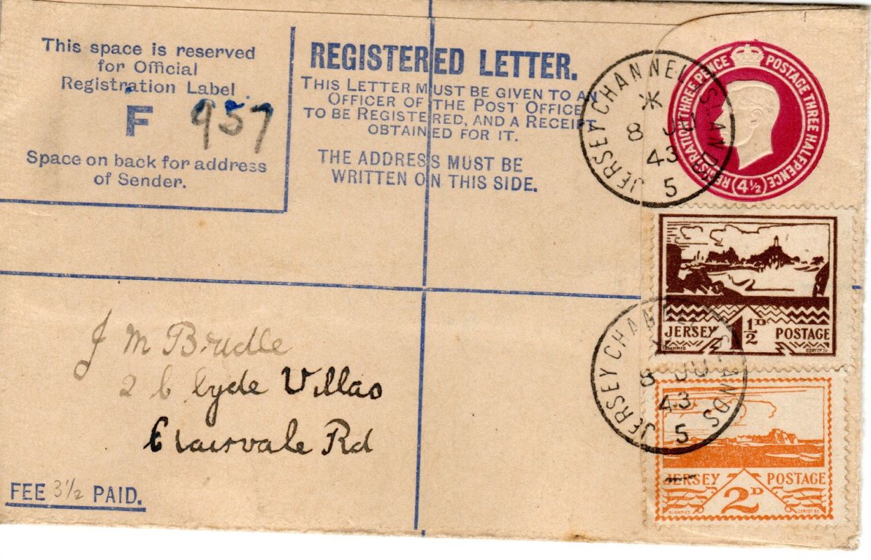 | 708 | JERSEY - March 1943 uprated registered postal stationery env from Lloyds Bank. Uprated with 1d Arms. With JERSEY registration label | 25.00 | 25.00 | |
