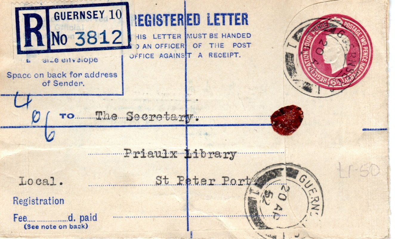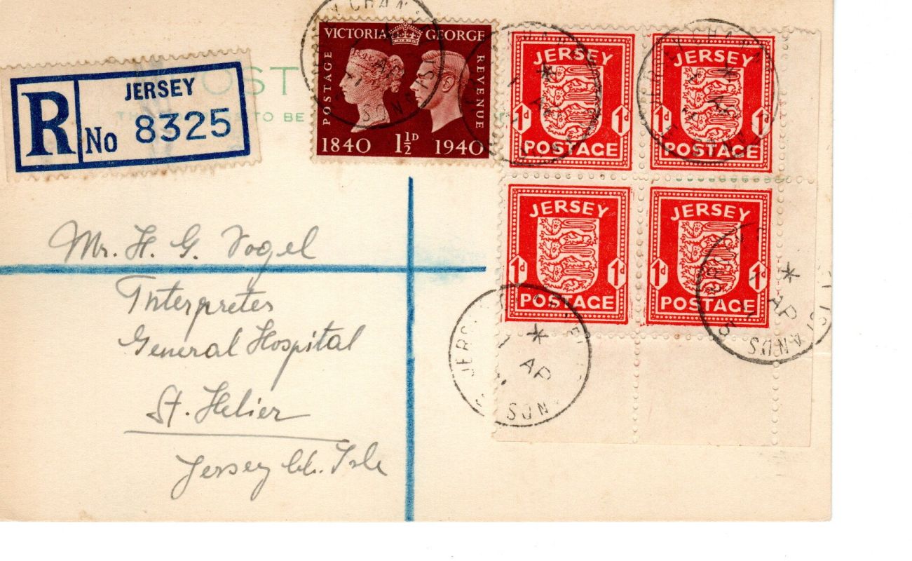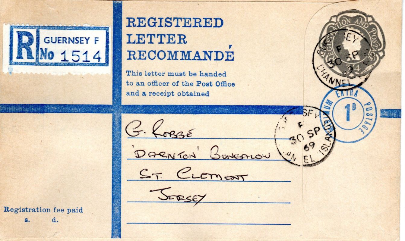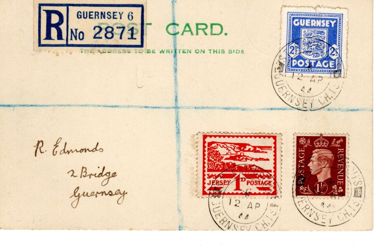 | 708 | JERSEY - March 1943 uprated registered postal stationery env from Lloyds Bank. Uprated with 1d Arms. With JERSEY registration label | 25.00 | 25.00 | |