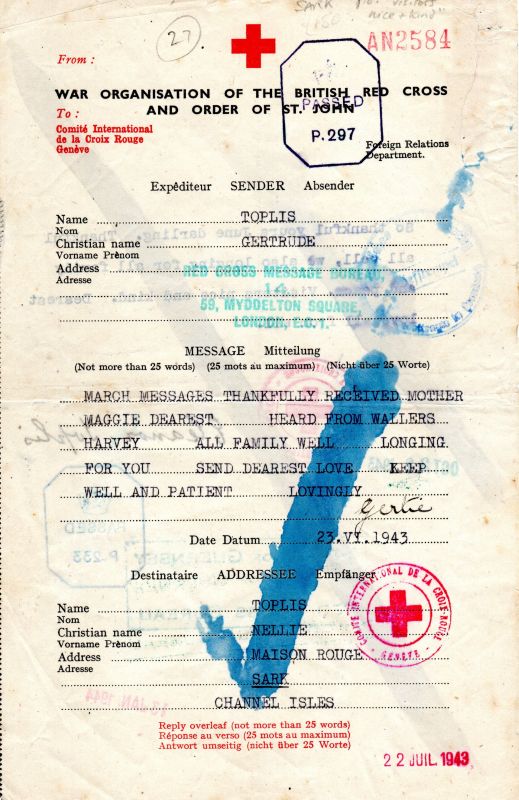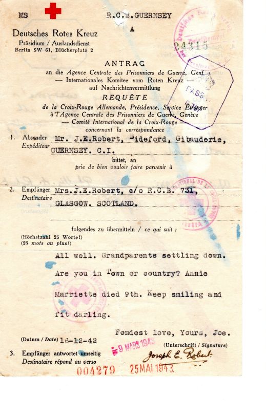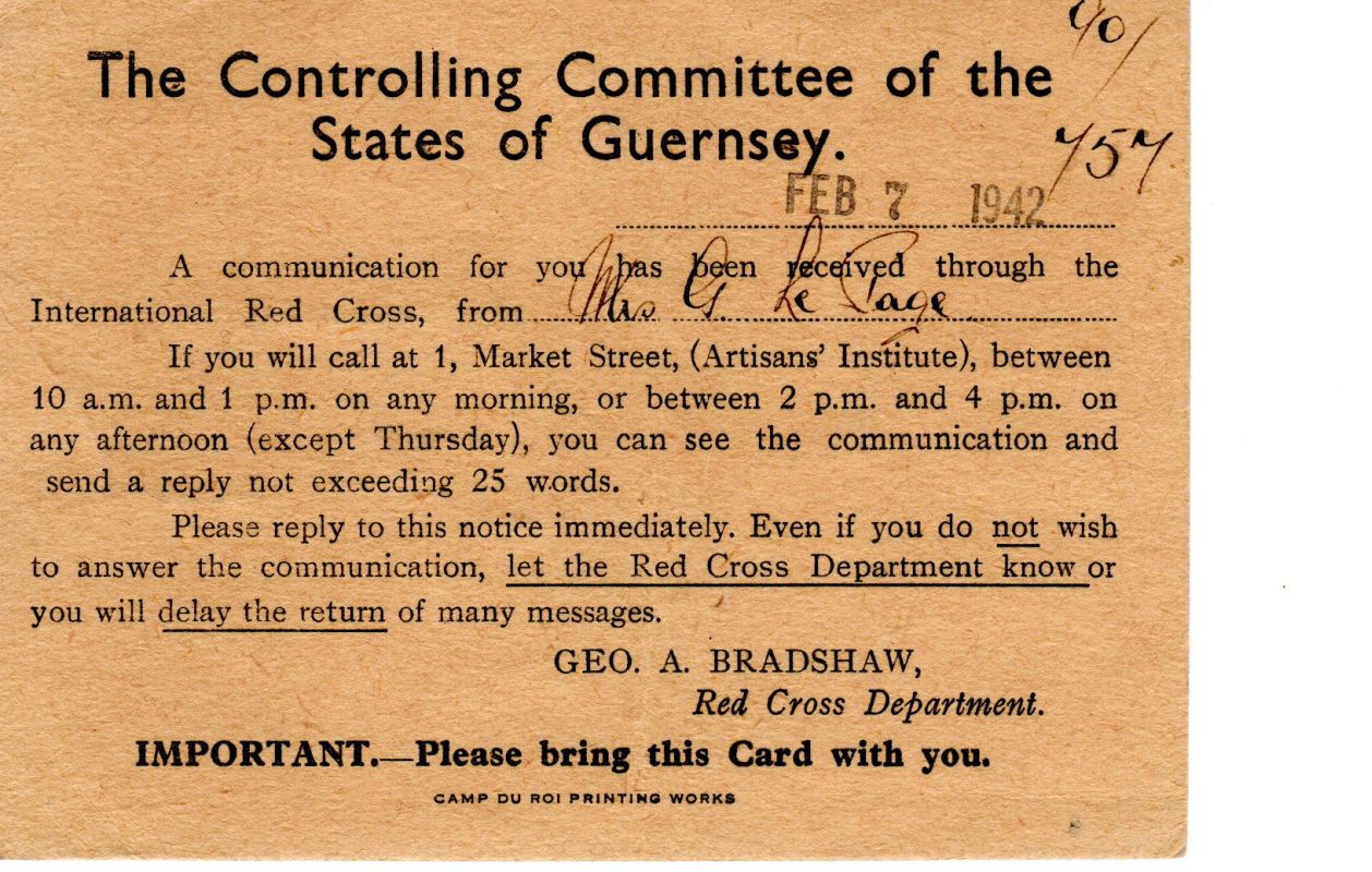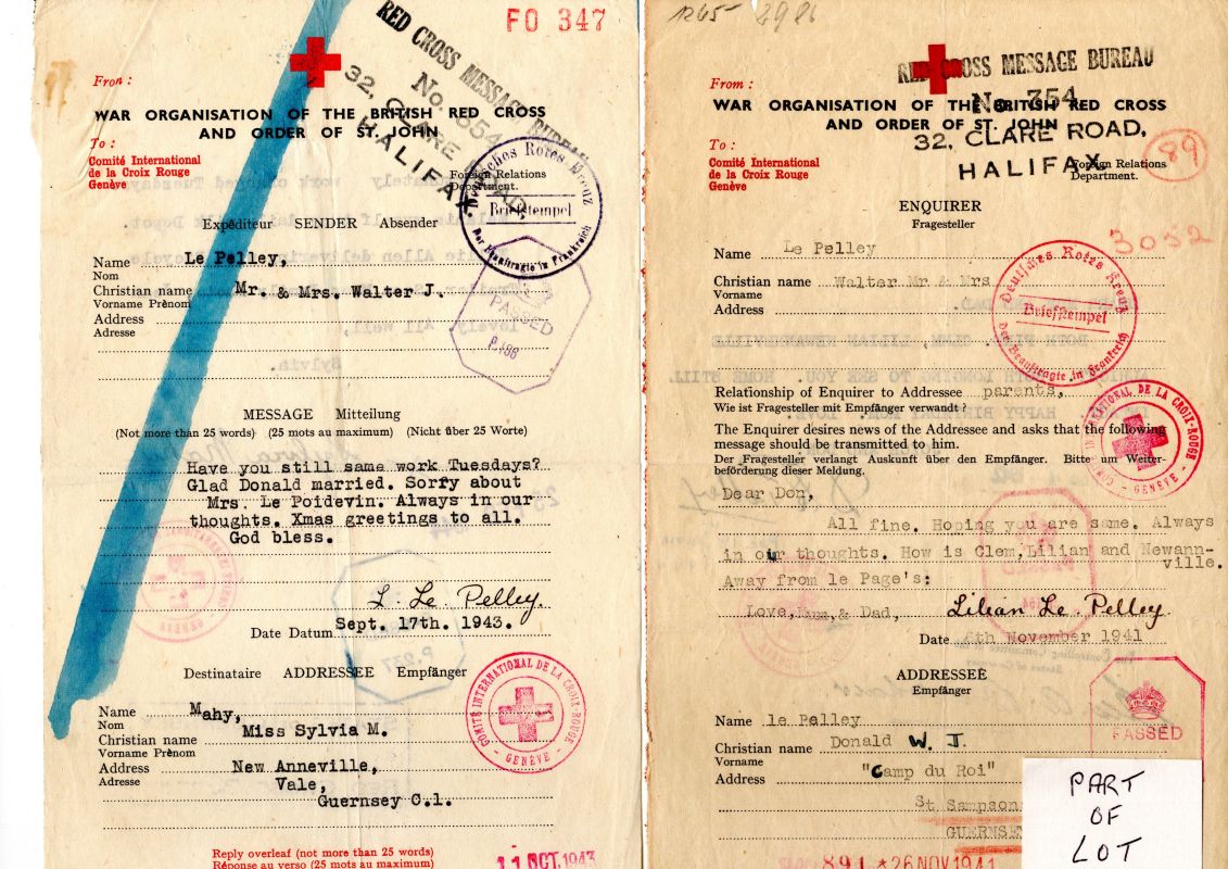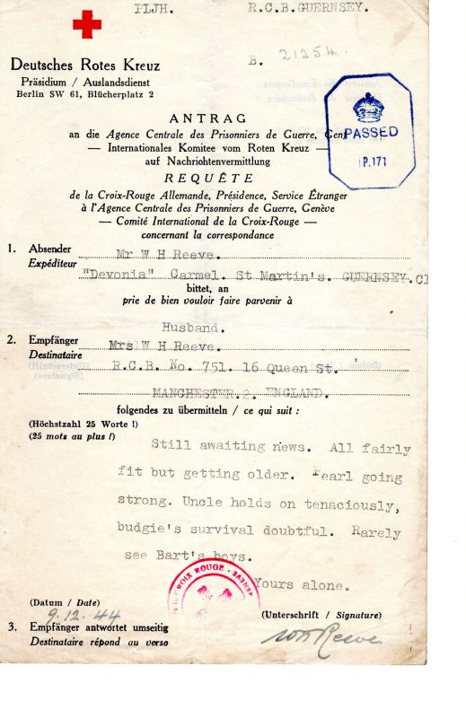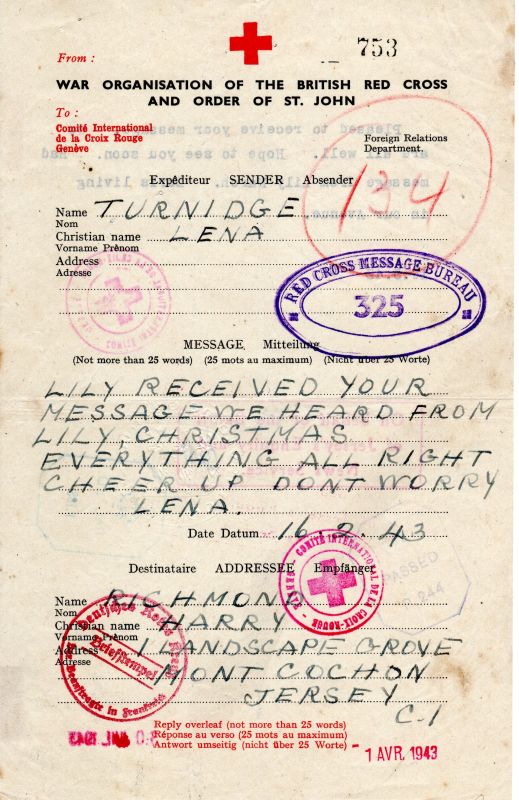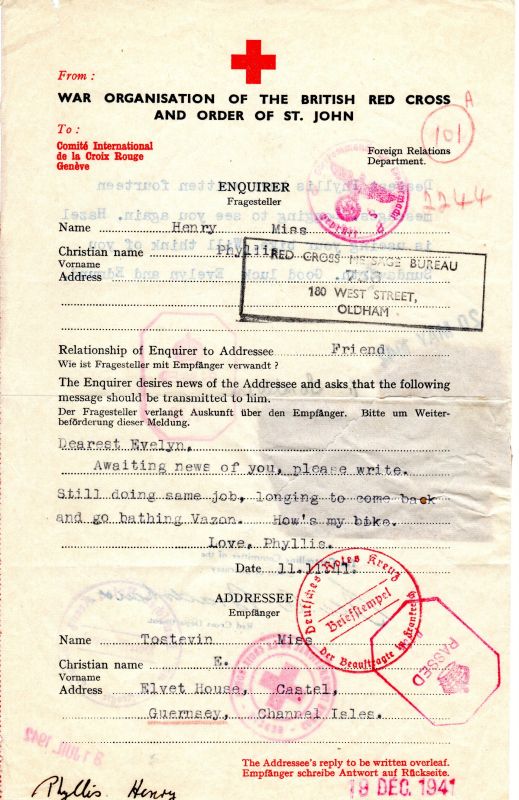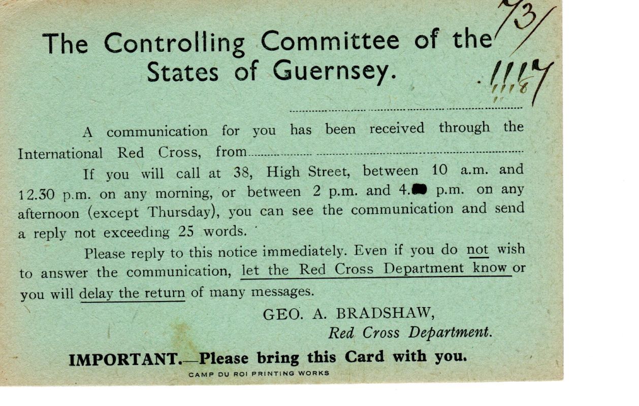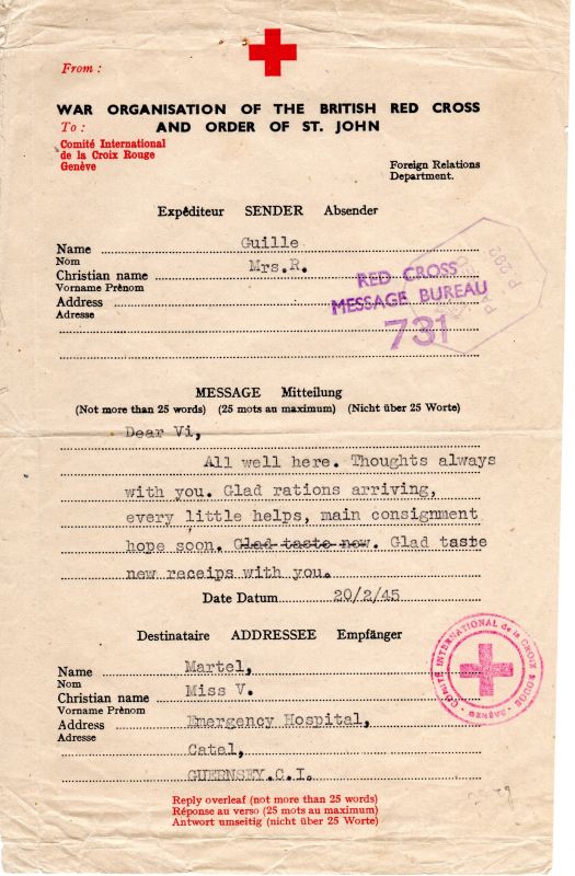 | 709 | RED CROSS Message form - sent 20 Feb 1945 from England to Miss Martel, Emergency Hospital, Catel, Guernsey. With Swiss Red Cross cachet only. No reply. Probably reached Guernsey after Liberation | 12.00 | 9.50 | |