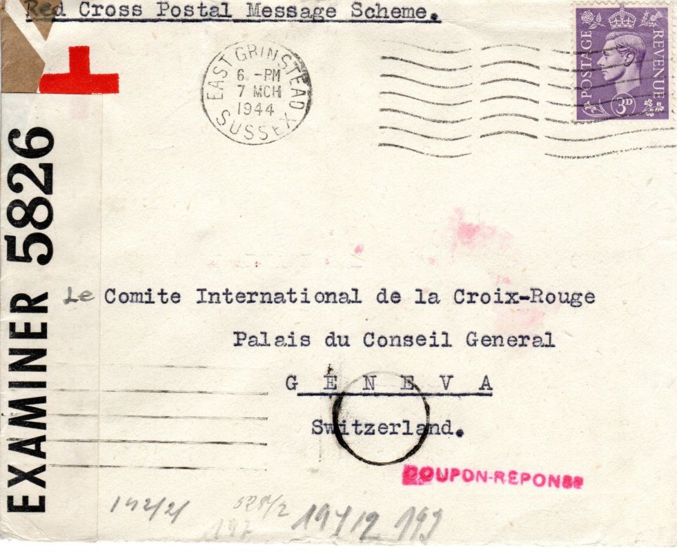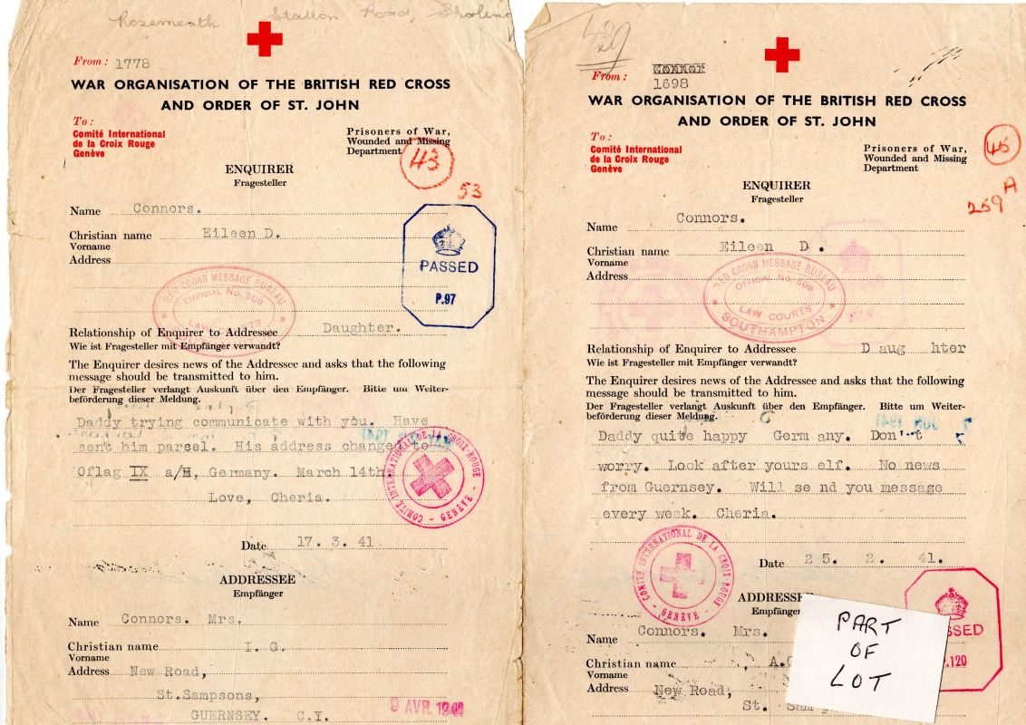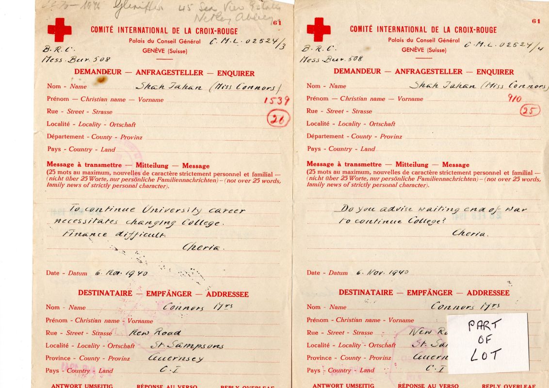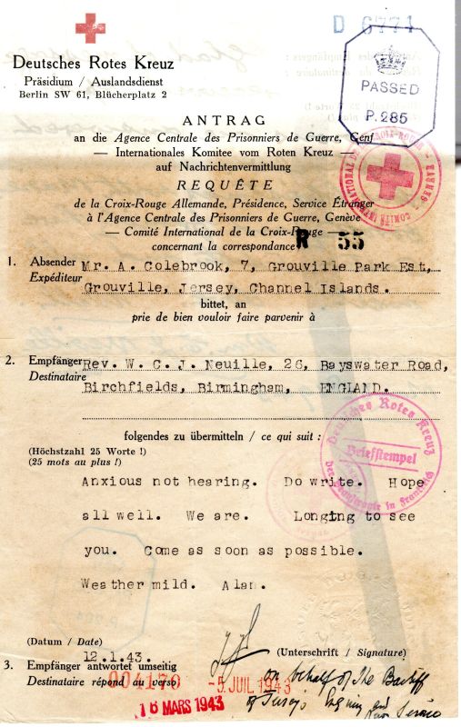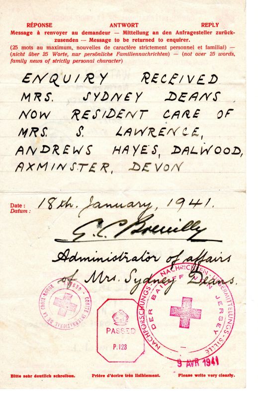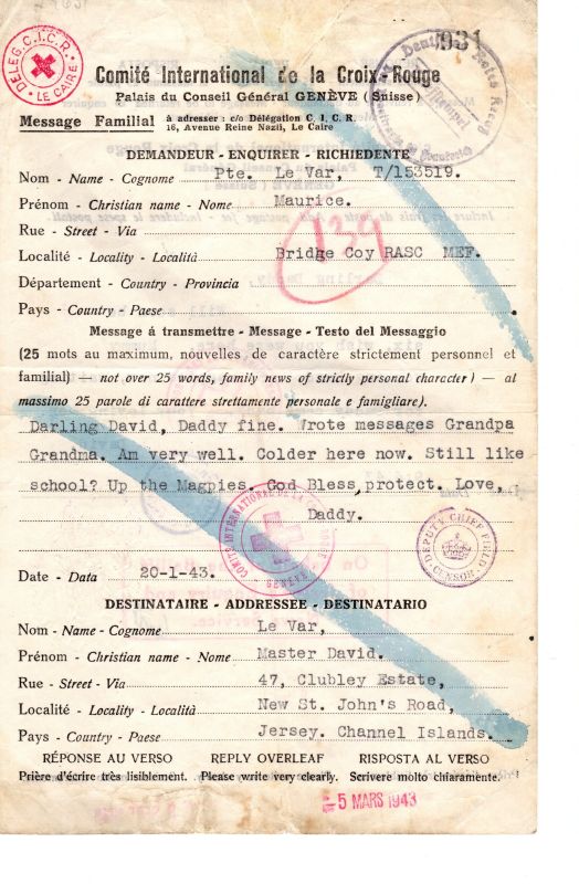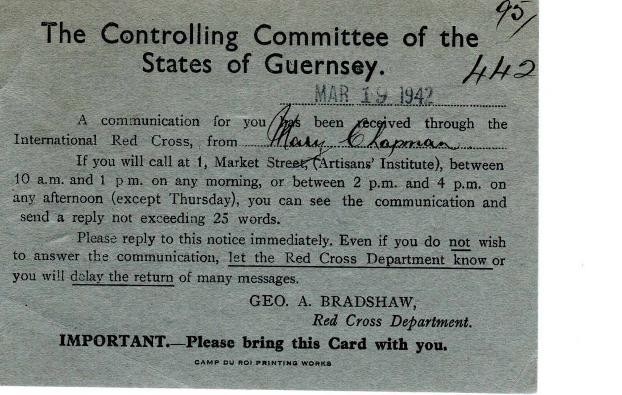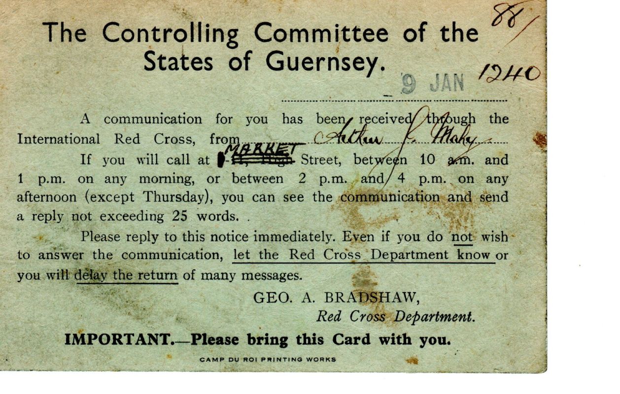 | 709 | RED CROSS Message form - sent 20 Feb 1945 from England to Miss Martel, Emergency Hospital, Catel, Guernsey. With Swiss Red Cross cachet only. No reply. Probably reached Guernsey after Liberation | 12.00 | 9.50 | |