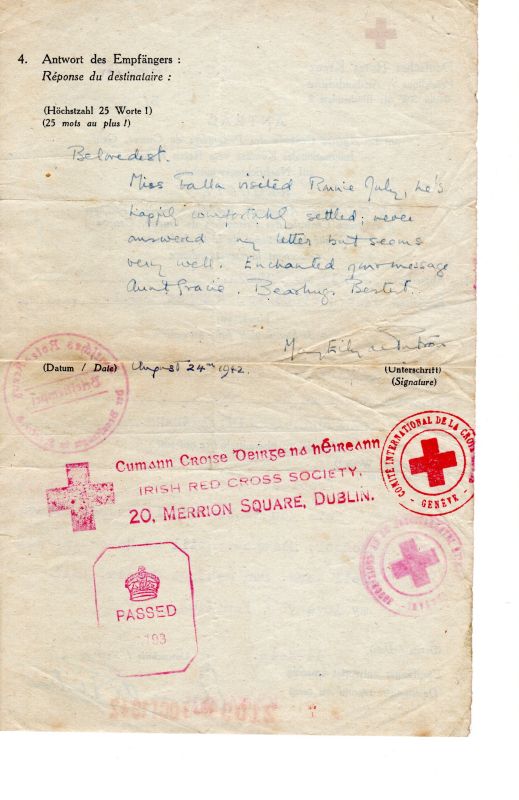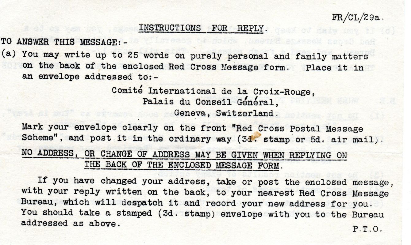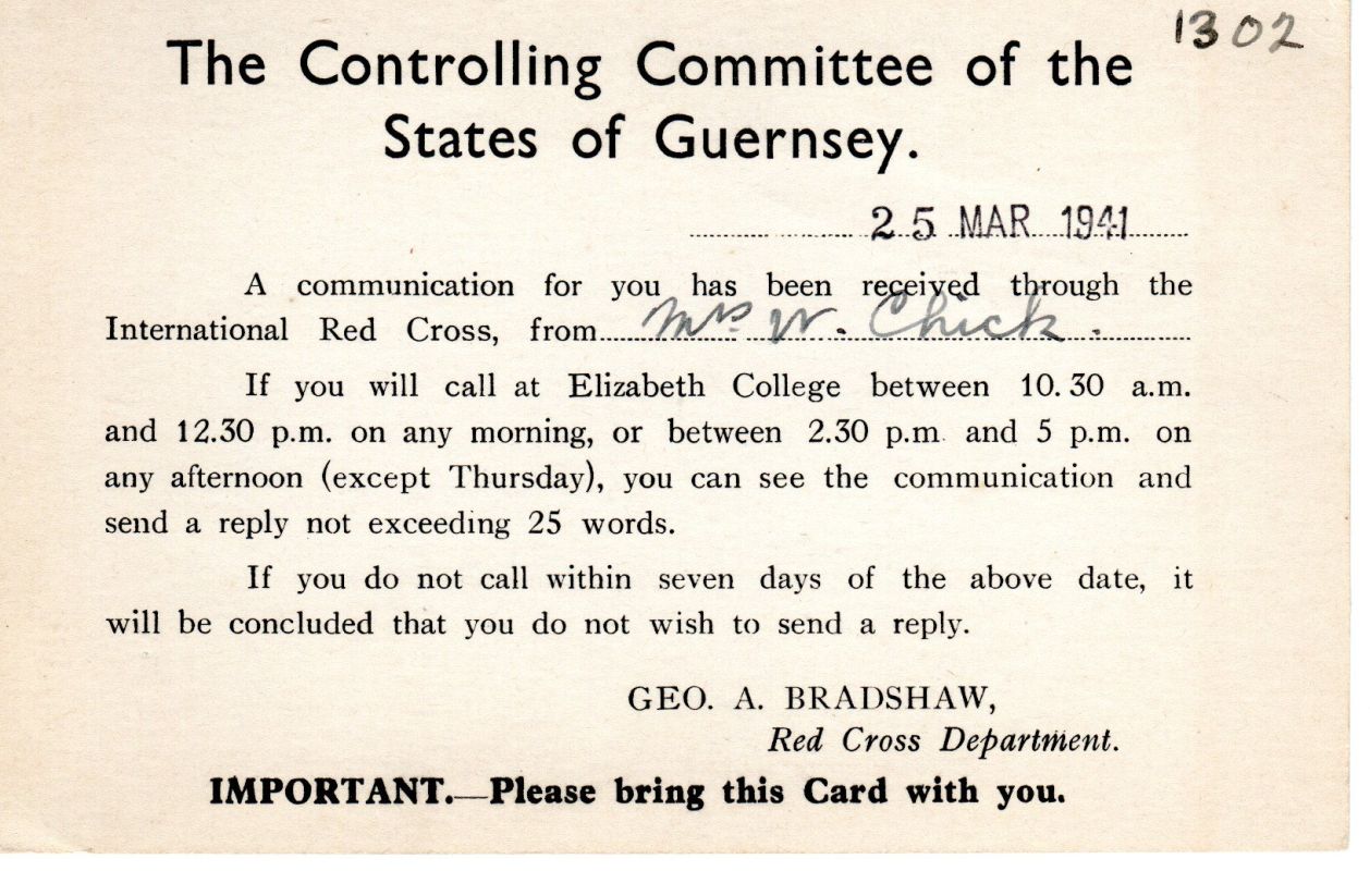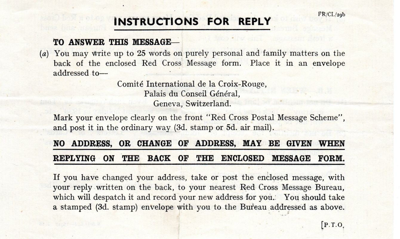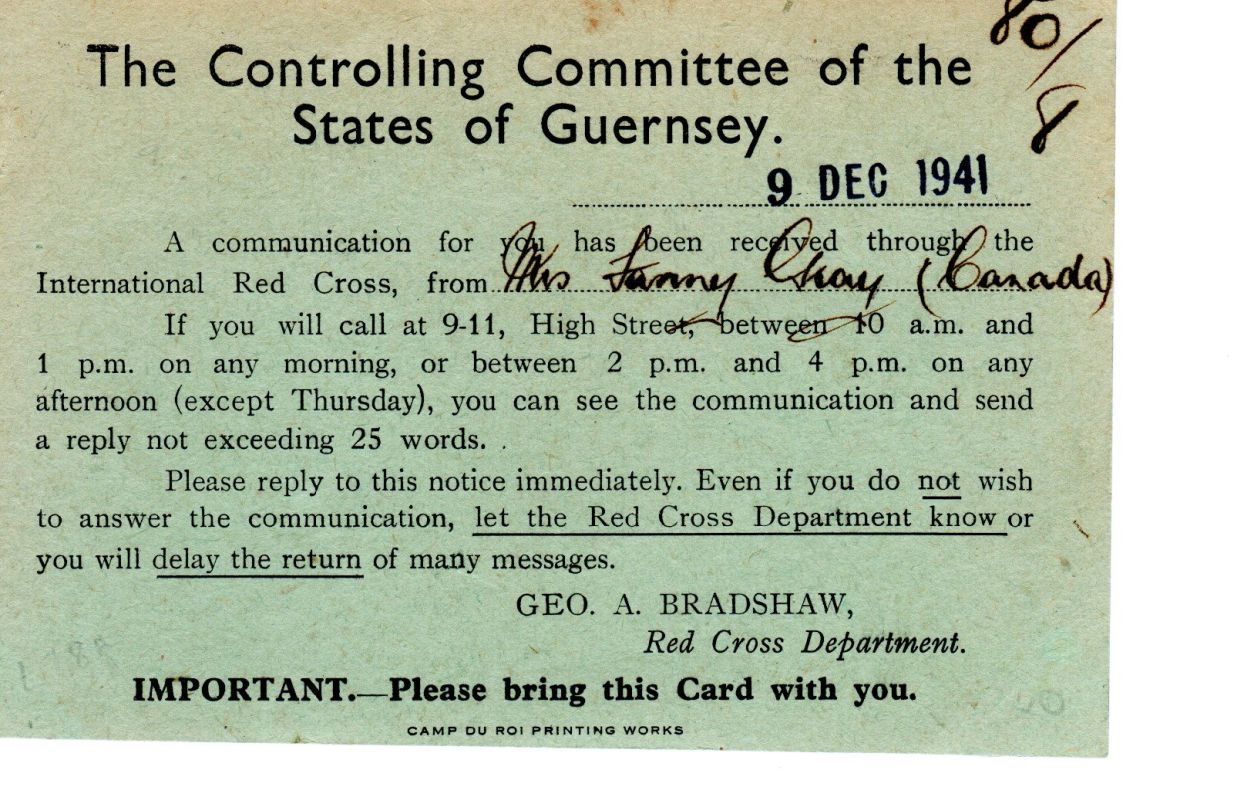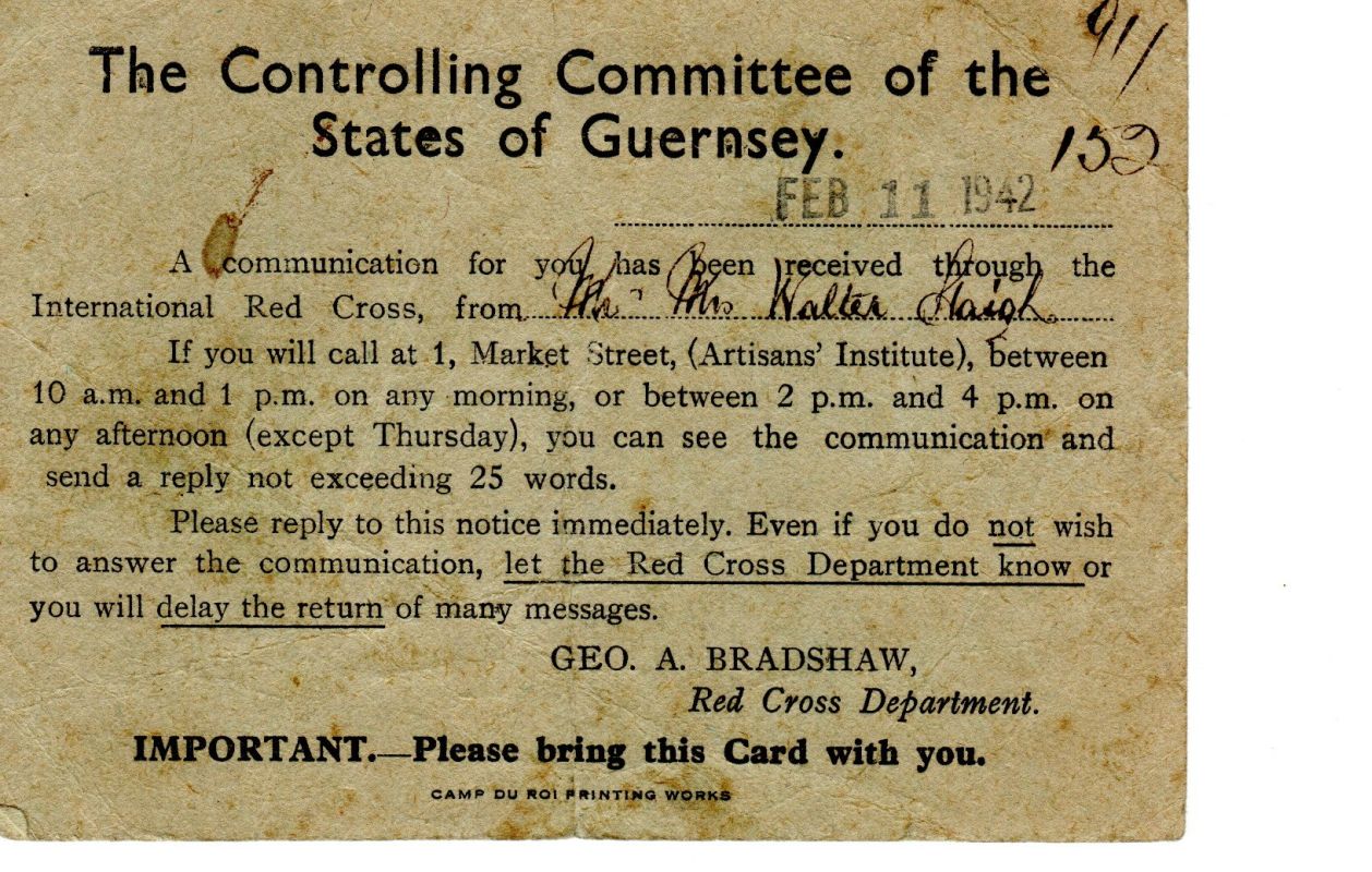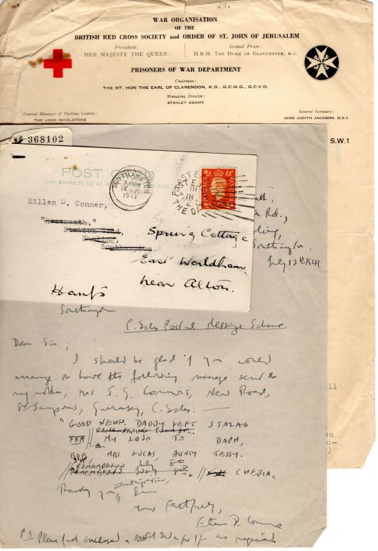 | 709 | RED CROSS Message form - sent 20 Feb 1945 from England to Miss Martel, Emergency Hospital, Catel, Guernsey. With Swiss Red Cross cachet only. No reply. Probably reached Guernsey after Liberation | 12.00 | 9.50 | |
