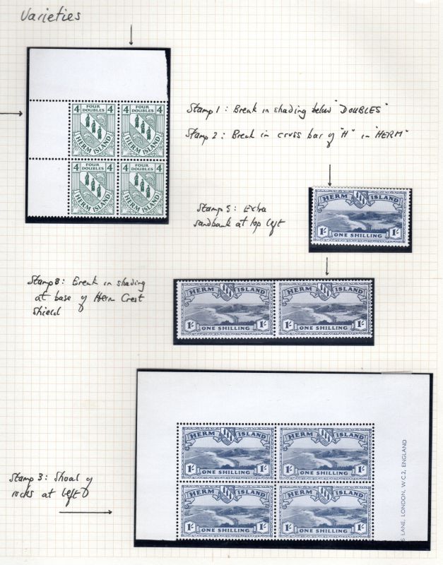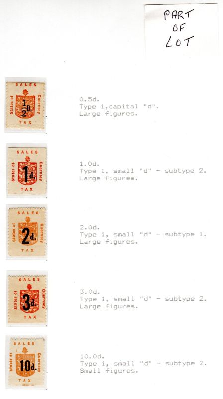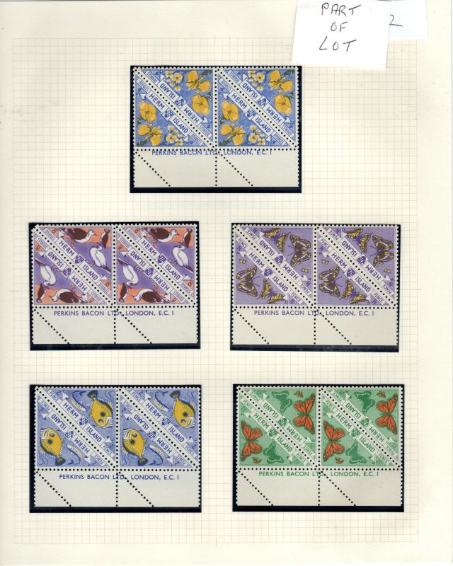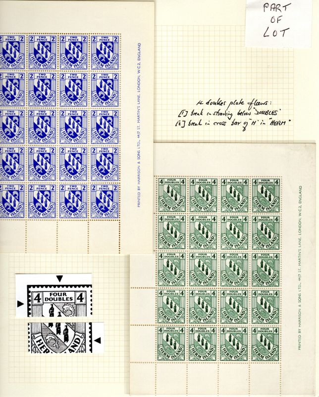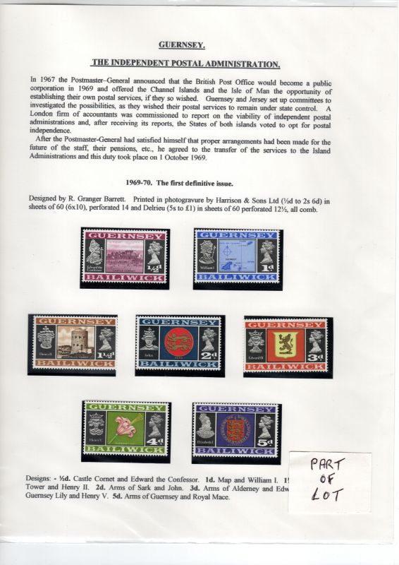 | 697 | GUERNSEY - Attractively typed-up collection of the Guernsey 1969 definitive issue including reprints and paper varieties and booklet stamps. Also a study, mostly in blocks of 4, of flaws and varieties, including single varieties of 10/- and £1 (15 pages). Similar collection of 1971-73 Decimal currency issue with flaws and varieties (9 pages). In 22-ring Pragnell album | 25.00 | 36.00 | |